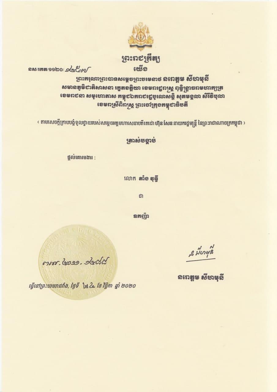 ព្រះករុណាព្រះបាទសម្តេចព្រះបរមនាថ នរោត្តម សីហមុនី ព្រះមហាក្សក្រនៃព្រះរាជាណាចក្រកម្ពុជា សព្វព្រះរាជហរទ័យត្រាស់បង្គាប់ផ្តល់គោរមងារ លោក តាំង វុទ្ធី ជាឧកញ៉ា នៅថ្ងៃទី២៤ ខែវិច្ឆិកា ឆ្នាំ២០២០។ តាមសេចក្តីក្រាប់បង្គំទូលថ្វាយរបស់សម្តេចតេជោ ហ៊ុន សែន នាយករដ្ឋមន្ត្រីនៃព្រះរាជាណាចក្រកម្ពុជា។