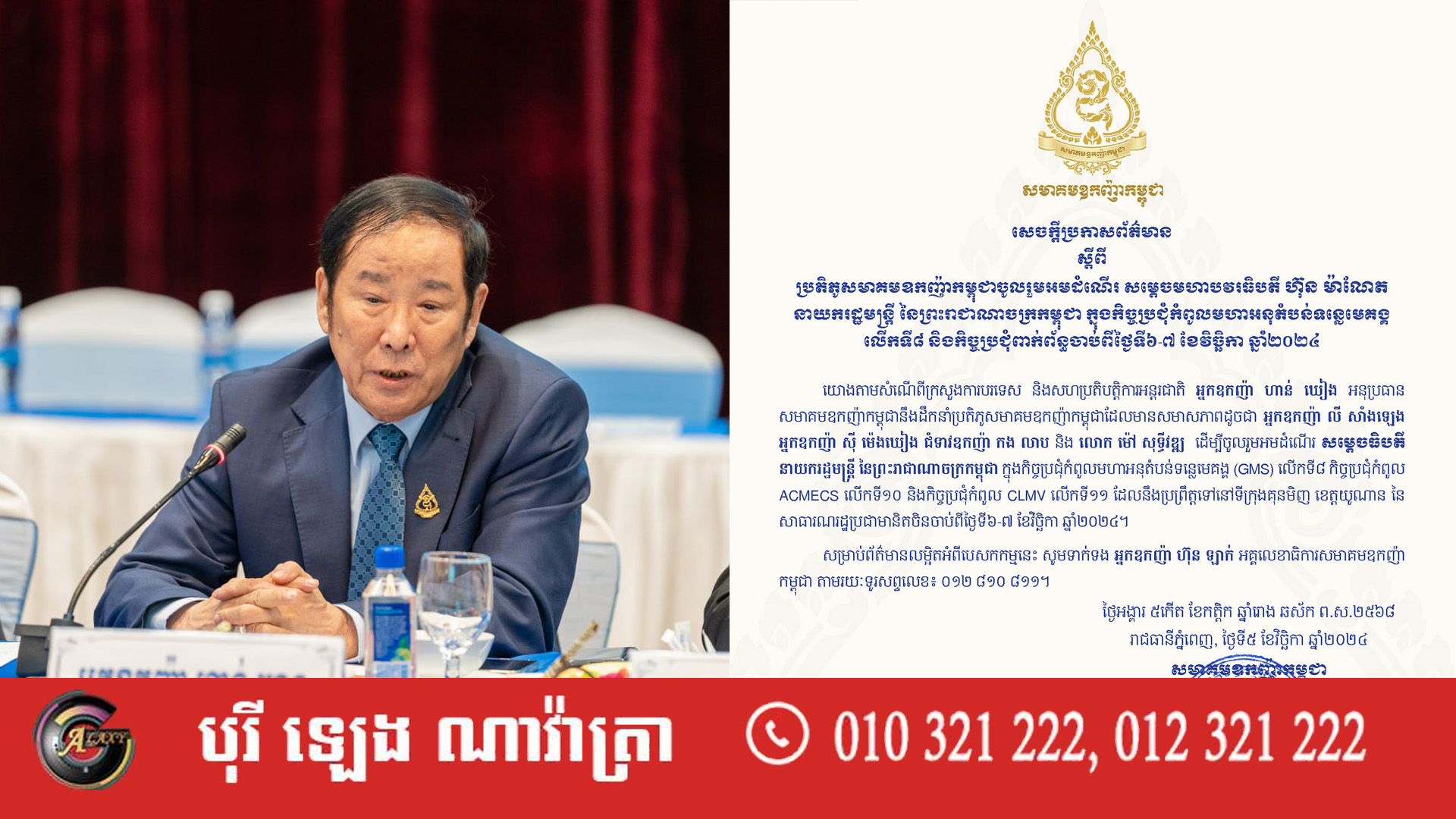 អ្នកឧកញ៉ា ហាន់ ឃៀង អនុប្រធានសមាគមឧកញ៉ាកម្ពុជា នឹងដឹកនាំប្រតិភូសមាគមឧកញ៉ាកម្ពុដែលមានសមាសភាពដូចជា អ្នកឧកញ៉ា លី សាំងឡេង អ្នកឧកញ៉ា ស៊ី ម៉េងឃៀង ជំទាវឧកញ៉ា កង លាប និង លោក ម៉ៅ សុទ្ធីវឌ្ឍ ដើម្បីចូលរួមអមដំណើរ សម្តេចធិបតី នាយករដ្ឋមន្ត្រី នៃព្រះរាជាណាចក្រកម្ពុជា ក្នុងកិច្ចប្រជុំកំពូលមហាអនុតំបន់ទន្លេមេគង្គ (GMS) លើកទី៨ កិច្ចប្រជុំកំពូល ACMECS លើកទី១០ និងកិច្ចប្រជុំកំពូល CLMV លើកទី១១ ដែលនឹងប្រព្រឹត្តទៅនៅទីក្រុងគុនមិញ ខេត្តយូណាន នៃសាធារណរដ្ឋប្រជាមានិតចាប់ពីថ្ងៃទី៦-៧ ខែវិច្ឆិកា ឆ្នាំ២០២៤។