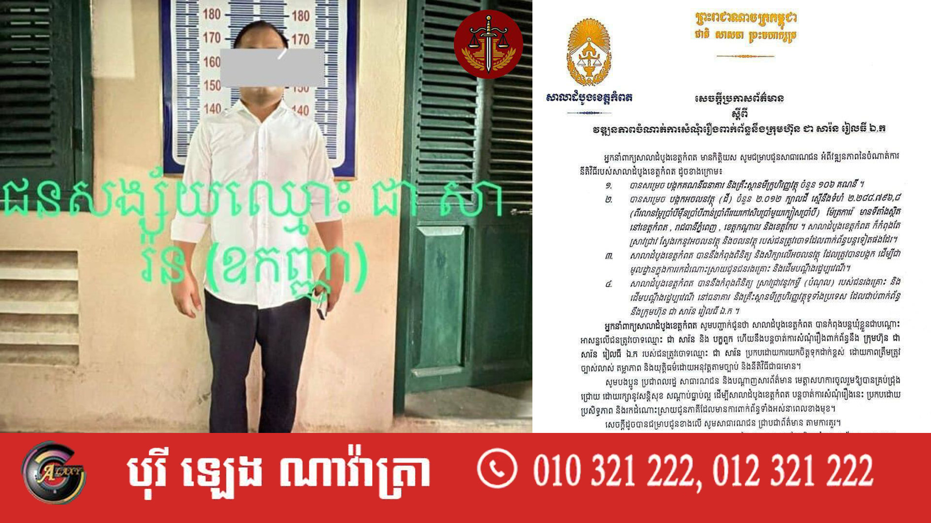 សាលាដំបូងខេត្តកំពត កាលពីថ្ងៃទី១៩ ខែវិច្ឆិកា ឆ្នាំ២០២៤ បានចេញសេចក្តីប្រកាសព័ត៌មានស្តីពីវឌ្ឍនភាពចំណាត់ការសំណុំរឿងពាក់ព័ន្ធនឹងថក្រុមហ៊ុន ជា សារ៉ន រៀលធី ឯ.ក របស់អតីតឧកញ៉ា ជា សារ៉ន។