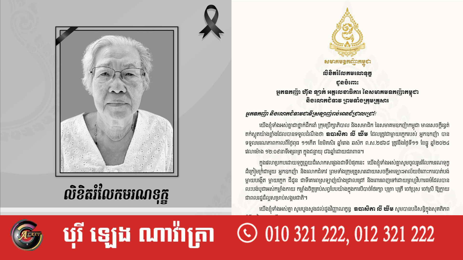 ថ្នាក់ដឹកនាំ សមាជិក សមាជិកានៃសមាគមឧកញ៉ាកម្ពុជាទាំងអស់ សូមបួងសួងដល់ដួងវិញ្ញាណក្ខន្ធ ឧបាសិកា លី ឃីម សូមបានបដិសន្ធិក្នុងសុគតិភពកុំបីឃ្លៀងឃ្លាតឡើយ៕