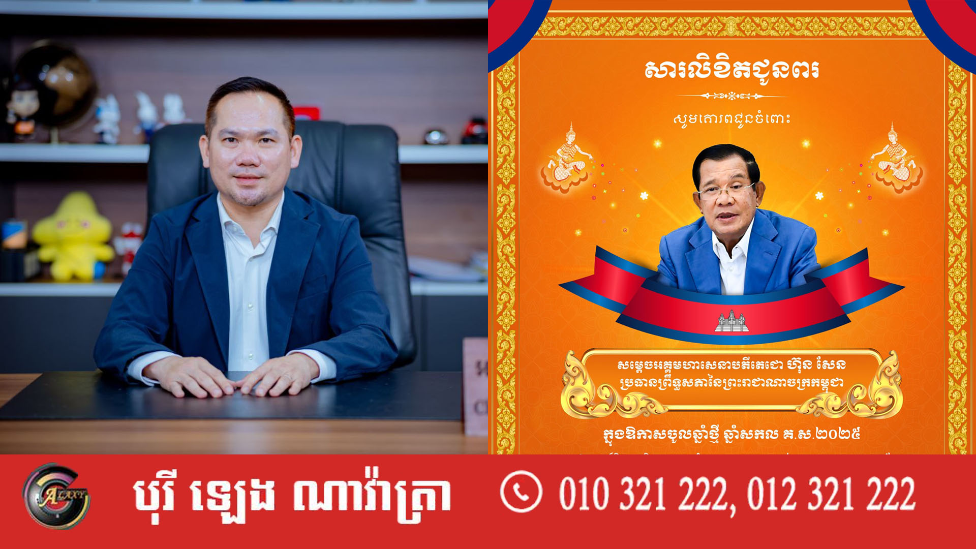 អ្នកឧកញ៉ា សួរ វីរៈ នាយកប្រតិបត្តិក្រុមហ៊ុនវិរៈ ប៊ុនថាំ អេចប្រេស និងជាទីប្រឹក្សារបស់ សម្តេចអគ្គមហាសេនាបតីតេជោ ហ៊ុន សែន ប្រធានគណបក្សប្រជាជនកម្ពុជា សូមផ្ញើសារលិខិតជូនពរ សម្តេចតេជោ ហ៊ុន សែន ប្រធានព្រឹទ្ធសភា នៃព្រះរាជាណាចក្រកម្ពុជា ក្នុងឱកាសចូលឆ្នាំថ្មី ឆ្នាំសកល២០២៥។