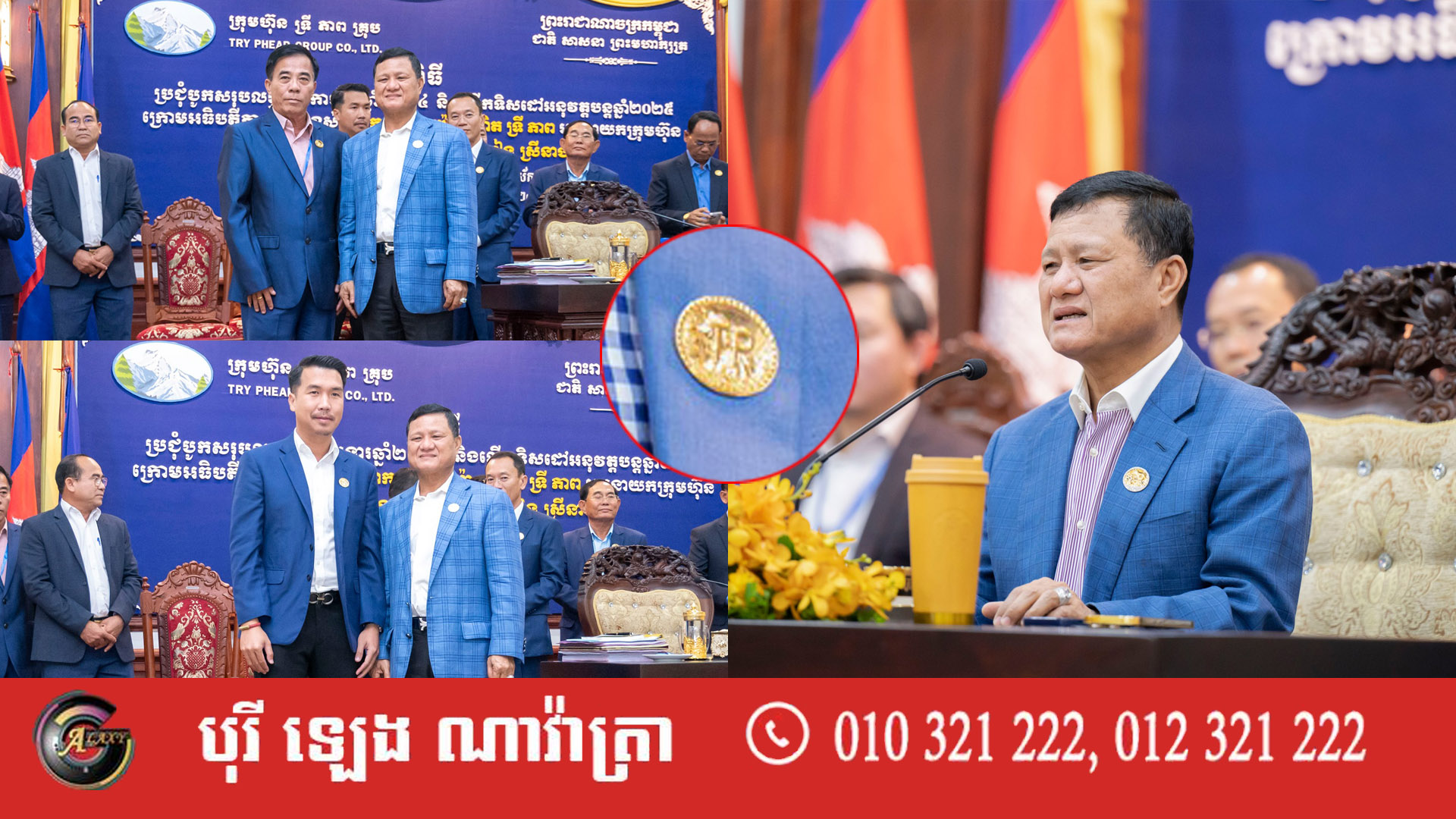លោកអ្នកឧកញ៉ា ទ្រី ភាព អគ្គនាយកក្រុមហ៊ុន ទ្រី ភាព គ្រុប បានបំពាក់និមិត្តសញ្ញាក្រុមហ៊ុនធ្វើអំពីមាស ទម្ងន់ ៥ជី ជូនដល់ថ្នាក់ដឹកនាំ និងបុគ្គលិកឆ្នើមប្រចាំឆ្នាំមួយចំនួន ក្នុងកិច្ចប្រជុំបូកសរុបលទ្ធផលការងារប្រចាំឆ្នាំ២០២៤ និងលើកទិសដៅអនុវត្តបន្តសម្រាប់ឆ្នាំ២០២៥ កាលពីថ្ងៃទី២៧ ខែធ្នូ ឆ្នាំ២០២៤។
