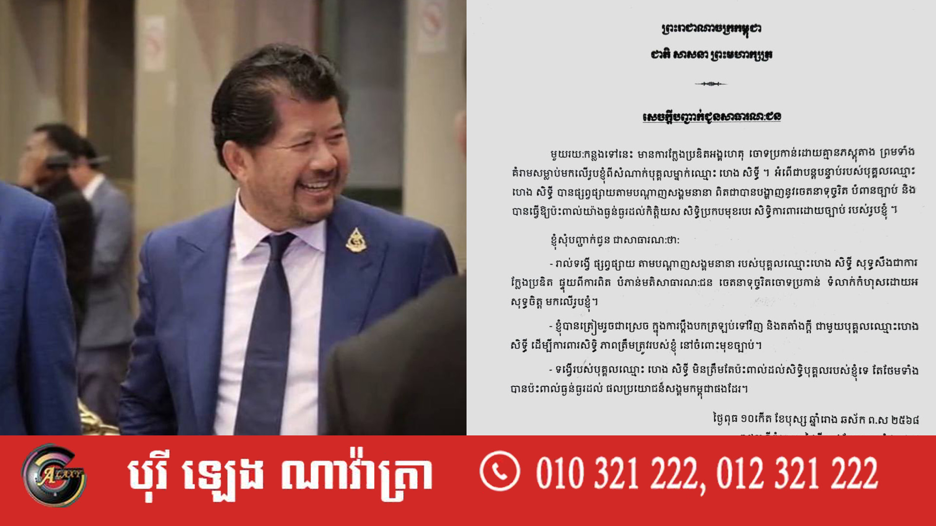 ១. រាល់ទង្វើផ្សព្វផ្សាយ តាមបណ្តាញសង្គមនានា របស់បុគ្គលឈ្មោះ ហេង សិទ្ធី សុទ្ធសឹងជាការក្លែងប្រឌិត ផ្ទុយពីការពិត បំភាន់មតិសាធារណៈជន ចេតនាទុច្ចរិតចោទប្រកាន់ ទំលាក់កំហុសដោយអសុទ្ធចិត្តមកលើរូបលោក។