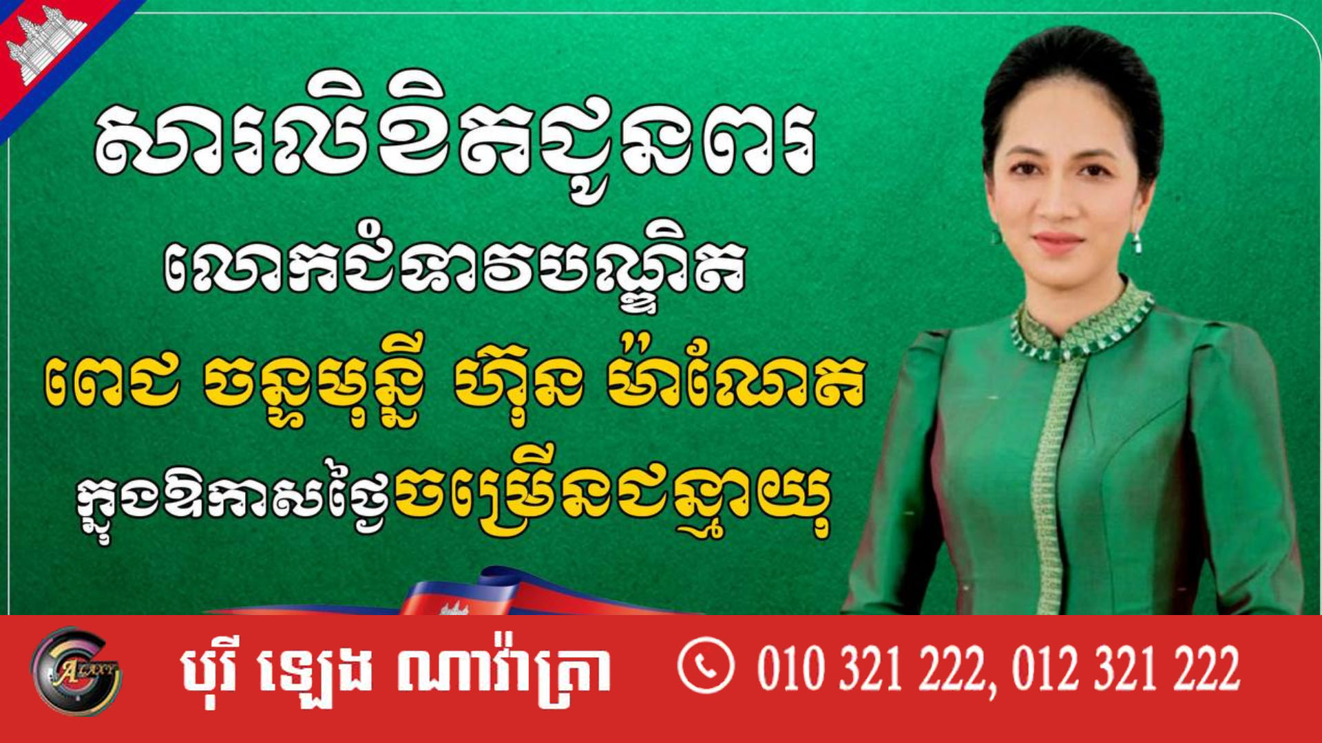 ជាថ្មីម្តងទៀត យើងខ្ញុំទាំងអស់គ្នា សូមលើកហត្ថបួងសួងដល់គុណបុណ្យព្រះរតនត្រ័យ គុណកែវទាំងបី ឫទ្ធិបារមីខ្លាំងក្លា វត្ថុស័ក្តិសិទ្ធិទាំងឡាយក្នុងលោក សូមមេត្តាតាមជួយអភិបាល គាំពារ ថែរក្សា លោកជំទាវបណ្ឌិត និងសម្តេចមហាបវរធិបតី ព្រមទាំងក្រុមគ្រួសារ សូមសមប្រកបតែនឹងពុទ្ធពរទាំងបួនប្រការគឺ អាយុ វណ្ណៈ សុខៈ ពលៈ ជានិច្ចនិរន្តរ៍៕
