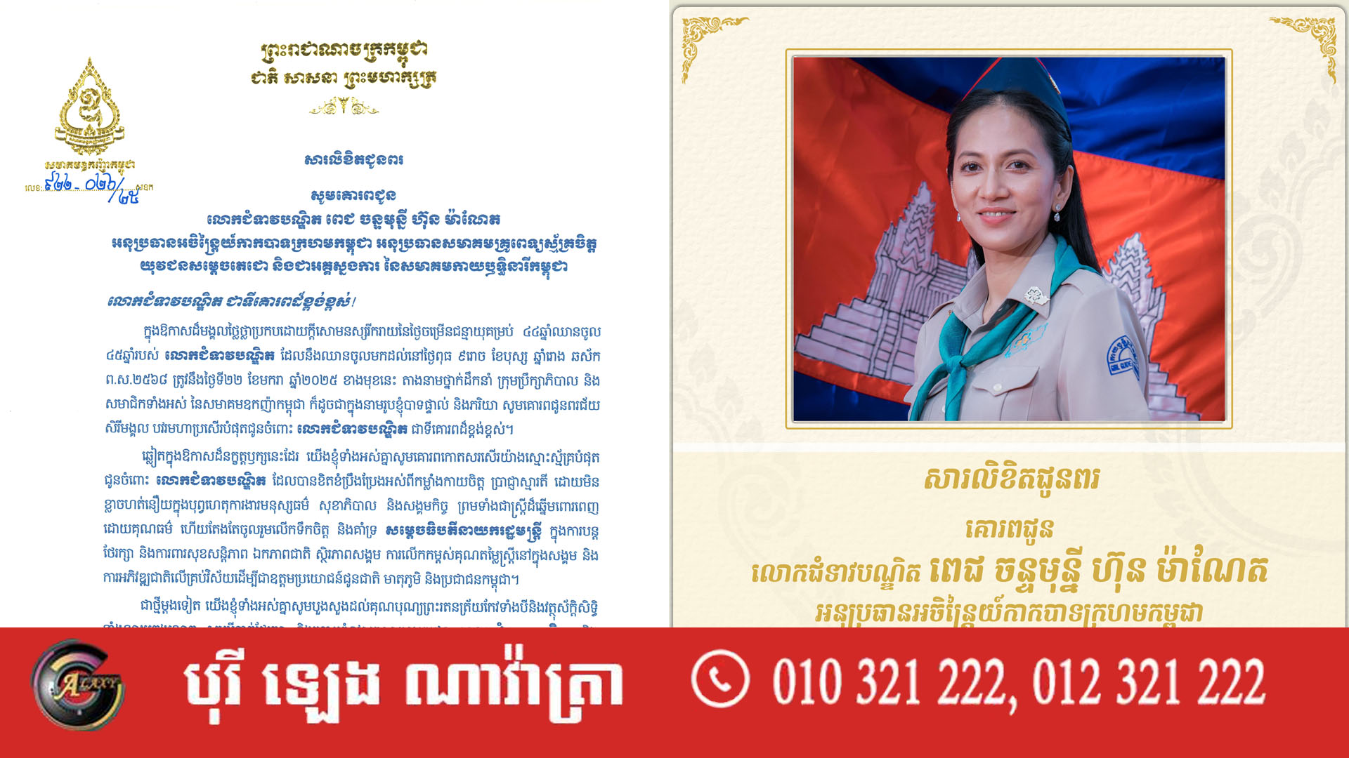 លោកអ្នកឧកញ៉ា លី យ៉ុងផាត់ ផ្ញើសារលិខិតជូនពរ លោកជំទាវបណ្ឌិត ពេជ ចន្ទមុន្នី ហ៊ុន ម៉ាណែត ក្នុងឱកាសថ្ងៃចម្រើនជន្មាយុ