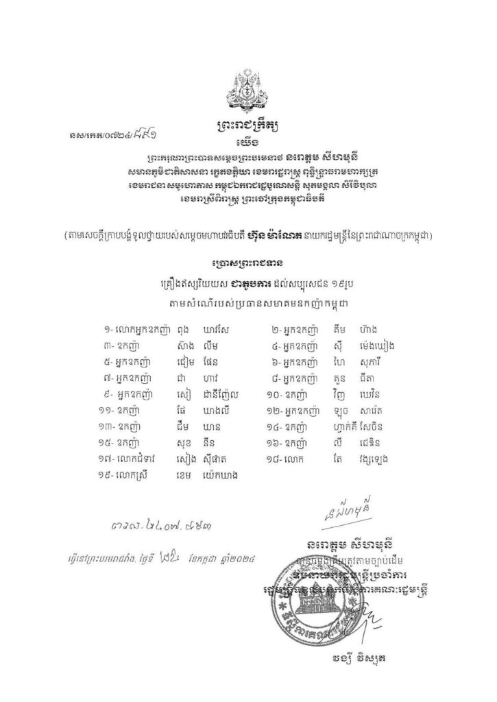 ព្រះករុណាព្រះបាទសម្តេចព្រះបរមនាថ នរោត្តម សីហមុនី ព្រះមហាក្សត្រ នៃព្រះរាជាណាចក្រកម្ពុជា កាលពីថ្ងៃទី២៥ ខែកក្កដា ឆ្នាំ២០២៤ បានប្រោសព្រះរាជទានគ្រឿងឥស្សរិយយសថ្នាក់ «ជាតូបការ» ដល់សប្បុរសជន ១៩រូប ក្នុងនោះរួមមាន លោកអ្នកឧកញ៉ា អ្នកឧកញ៉ា និងឧកញ៉ាៗ ដែលមានគោរមវន្តឧកញ៉ា ចំនួន ១៦រូប។