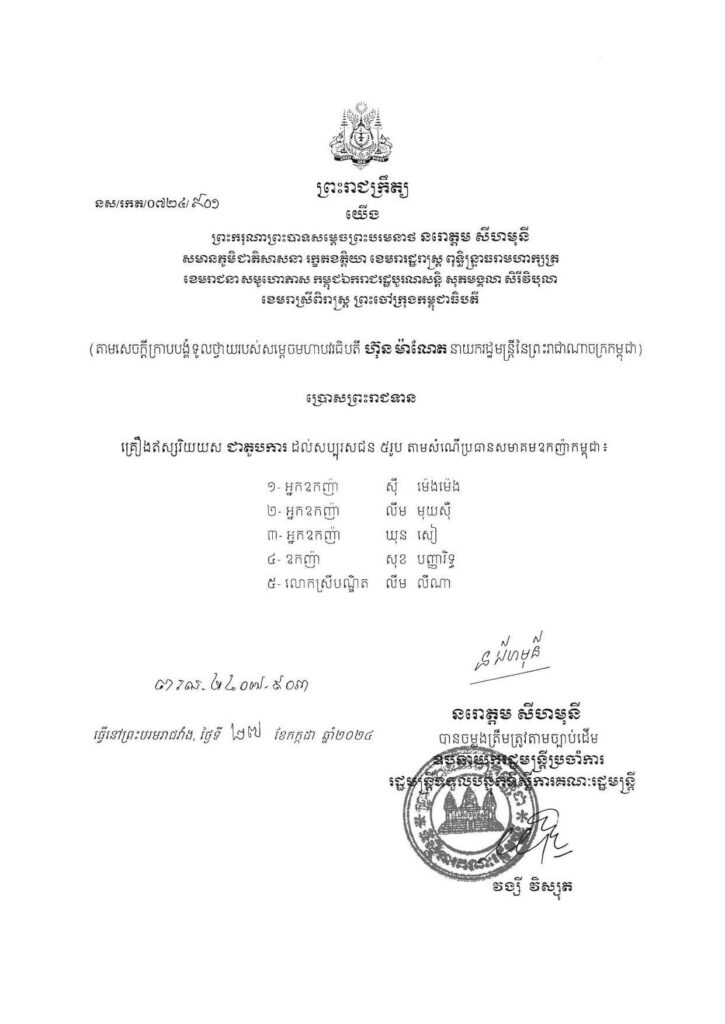 ព្រះរាជក្រឹត្យរបស់ព្រះមហាក្សត្រលេខ នស/រកត/០៧២៤/៩០១ ត្រូវបានធ្វើឡើងតាមសេចក្តីក្រាបបង្គំទូលថ្វាយរបស់សម្តេចមហាបវរធិបតី ហ៊ុន ម៉ាណែត នាយករដ្ឋមន្ត្រីកម្ពុជា និងតាមសំណើរបស់ លោកអ្នកឧកញ៉ា លី យ៉ុងផាត់ ប្រធានសមាគមឧកញ៉ាកម្ពុជា។