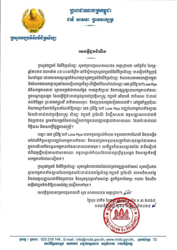នៅព្រឹកថ្ងៃទី៥ ខែកុម្ភៈ ឆ្នាំ២០២៥នេះ នៅទីស្តីការក្រសួងវប្បធម៌ និងវិចិត្រសិល្បៈ មានការរៀបចំកិច្ចប្រជុំណែនាំមួយ ដោយមានការចូលរួមពីតំណាងក្រសួងវប្បធម៌និងវិចិត្រសិល្បៈ តំណាងសមាគមឧកញ៉ាកម្ពុជា និងតំណាងនាយកដ្ឋានប្រឆាំងបទល្មើសបច្ចេកវិទ្យា ដើម្បីអប់រំណែនាំដល់ ឧកញ៉ា ឆេង ស្រីរ័ត្ន ហៅ Love Riya អំពីសកម្មភាពនានា ក្រោមទម្រង់ជាការសម្តែង ការអត្ថាធិប្បាយ និងការផ្សព្វផ្សាយសកម្មភាពទាំងនេះ ក្នុងបណ្តាញសង្គម ដែលធ្វើឱ្យប៉ះពាល់ធ្ងន់ធ្ងរដល់ប្រវត្តិសាស្ត្រ វប្បធម៌ អរិយធម៌ ជាពិសេសប៉ះពាល់ដល់និមិត្តរូប ព្រះនាងឥន្ទ្រទេវី ជាទីគោរពសក្ការៈ និងបុព្វបុរសផ្សេងទៀតរបស់ជាតិ។