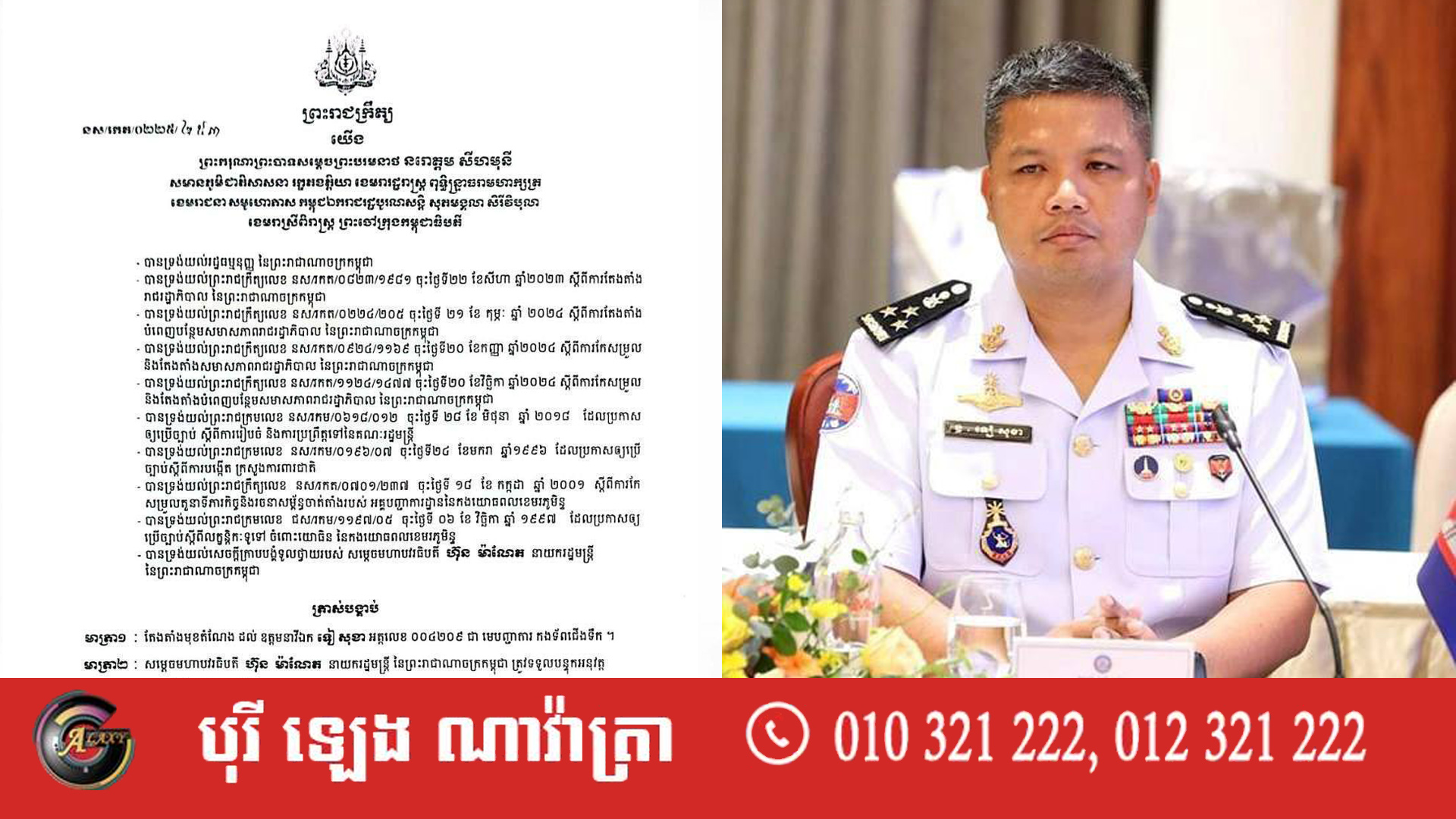 ព្រះករុណាព្រះបាទសម្តេចព្រះបរមនាថ នរោត្តម សីហមុនី ព្រះមហាក្សត្រនៃព្រះរាជាណាចក្រកម្ពុជា បានចេញព្រះរាជក្រឹត្យត្រាស់បង្គាប់តែងតាំងមុខតំណែងដល់ ឧត្តមនាវីឯក ទៀ សុខា អត្តលេខ ០០៤២០៩ ជា មេបញ្ជារការ កងទ័ពជើងទឹក នៃក្រសួងការពារជាតិ នៅថ្ងៃទី១៣ ខែកុម្ភៈ ឆ្នាំ២០២៥ តបតាមសេចក្តីក្រាបបង្គំទូលថ្វាយរបស់ សម្តេចមហាបវរធិបតី ហ៊ុន ម៉ាណែត នាយករដ្ឋមន្ត្រីនៃព្រះរាជាណាចក្រកម្ពុជា។