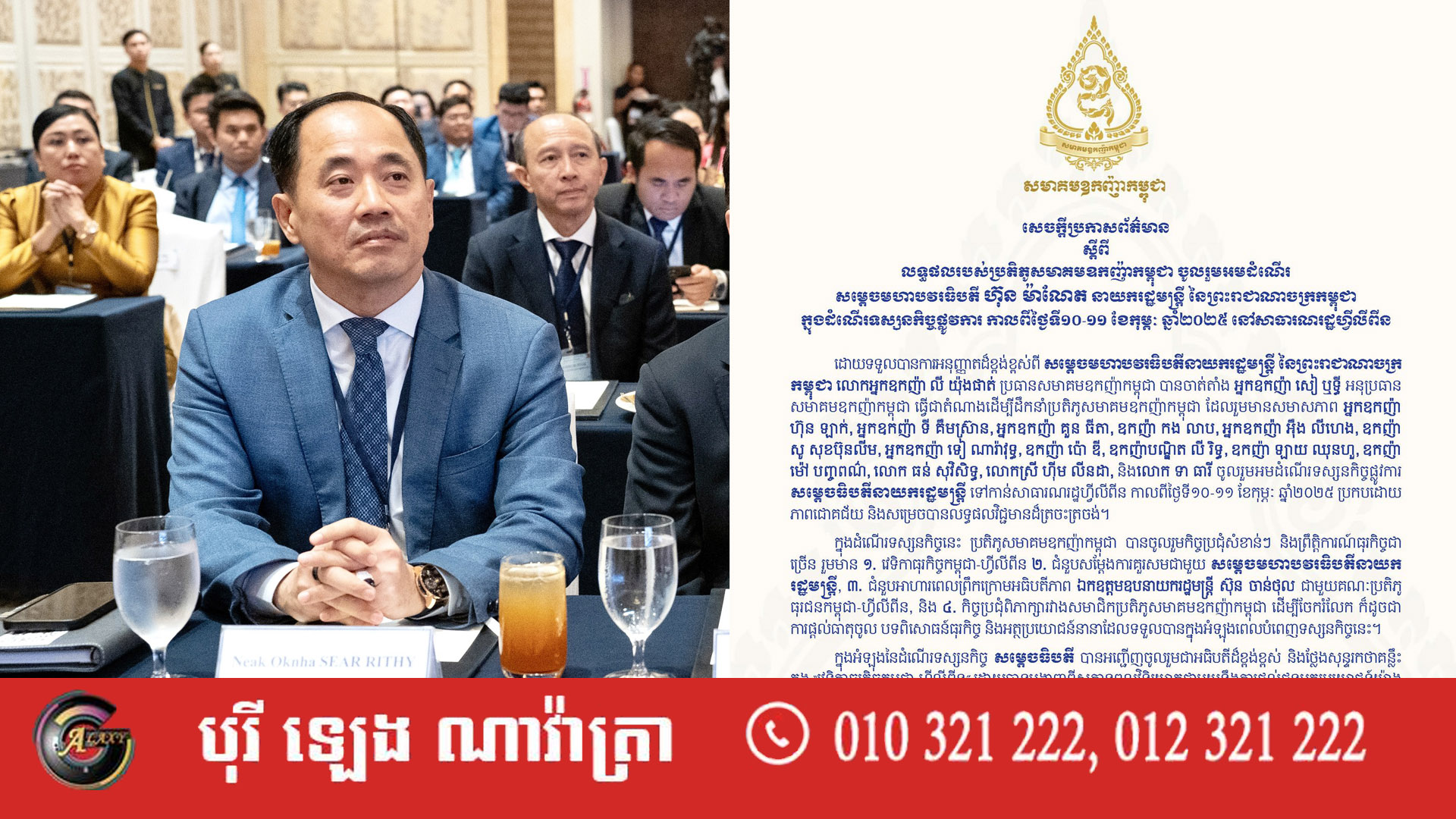 សមាគមឧកញ៉ាកម្ពុជា នៅថ្ងៃទី១២ ខែកុម្ភៈ ឆ្នាំ២០២៥ បានចេញសេចក្តីប្រកាសព័ត៌មាន ស្តីពីលទ្ធផលរបស់ប្រតិភូសមាគមឧកញ៉ាកម្ពុជា ចូលរួមអមដំណើរ សម្ដេចមហាបវរធិបតី ហ៊ុន ម៉ាណែត នាយករដ្ឋមន្ត្រី នៃព្រះរាជាណាចក្រកម្ពុជា ក្នុងដំណើរទស្សនកិច្ចផ្លូវការ កាលពីថ្ងៃទី១០-១១ ខែកុម្ភៈ ឆ្នាំ២០២៥ នៅសាធារណរដ្ឋហ្វីលីពីន។