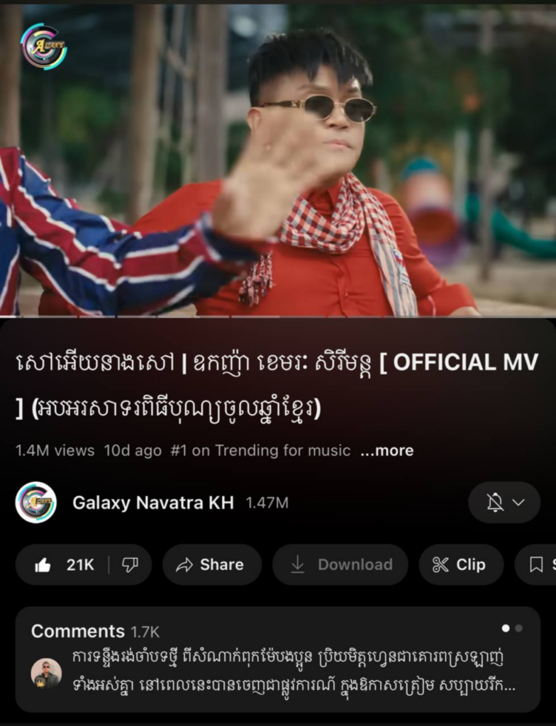 បទ «សៅអើយនាងសៅ» របស់កំពូលតារាចម្រៀងឧកញ៉ា ខេមរៈ សិរីមន្ដ ជាប់ត្រេនឌីងលេខ១ ក្នុង youtube