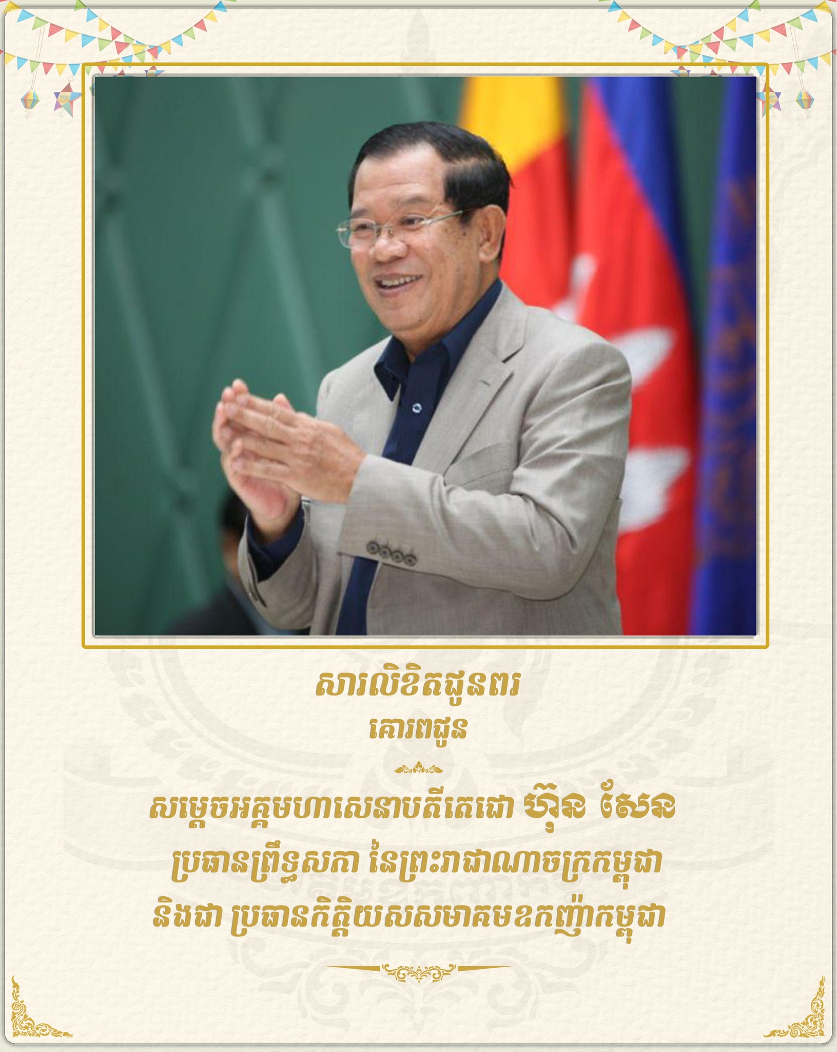 ឆ្លៀតក្នុងឱកាសដ៏ប្រពៃថ្លៃថ្លានេះដែរ យើងខ្ញុំទាំងអស់គ្នា សូមគោរពកោតសរសើរយ៉ាងស្មោះស្ម័គ្របំផុត និងចង់ចាំជានិច្ចនូវគំរូវីរភាពដ៏ឧត្តុងឧត្តមរបស់ សម្តេចតេជោ ដែលបានខិតខំប្រឹងប្រែងអស់ពីកម្លាំងកាយចិត្ត ប្រាជ្ញាស្មារតី មិនខ្លាចនឿយហត់ ដើម្បីបុព្វហេតុបម្រើឧត្តមប្រយោជន៍ជាតិ តាំងពីពេលដែលសម្តេច ស្ថិតក្នុងតំណែងជានាយករដ្ឋមន្ត្រី ដោយបាននាំមកនូវសុខសន្តិភាពពេញលេញ ឯកភាពជាតិ បូរណភាពទឹកដី ការអភិវឌ្ឍ៍សេដ្ឋកិច្ចសង្គមយ៉ាងឆាប់រហ័ស និងបានបន្តដឹកនាំស្ថាប័នព្រឹទ្ធសភាឱ្យសម្រេចបាននូវសមិទ្ធផលថ្មីៗជាច្រើនទៀត ក្នុងការពង្រឹងនីតិរដ្ឋដែលជាមូលដ្ឋានគ្រឹះ នៃការអភិវឌ្ឍប្រទេសជាតិក្រោមម្លប់នៃសន្តិភាព។