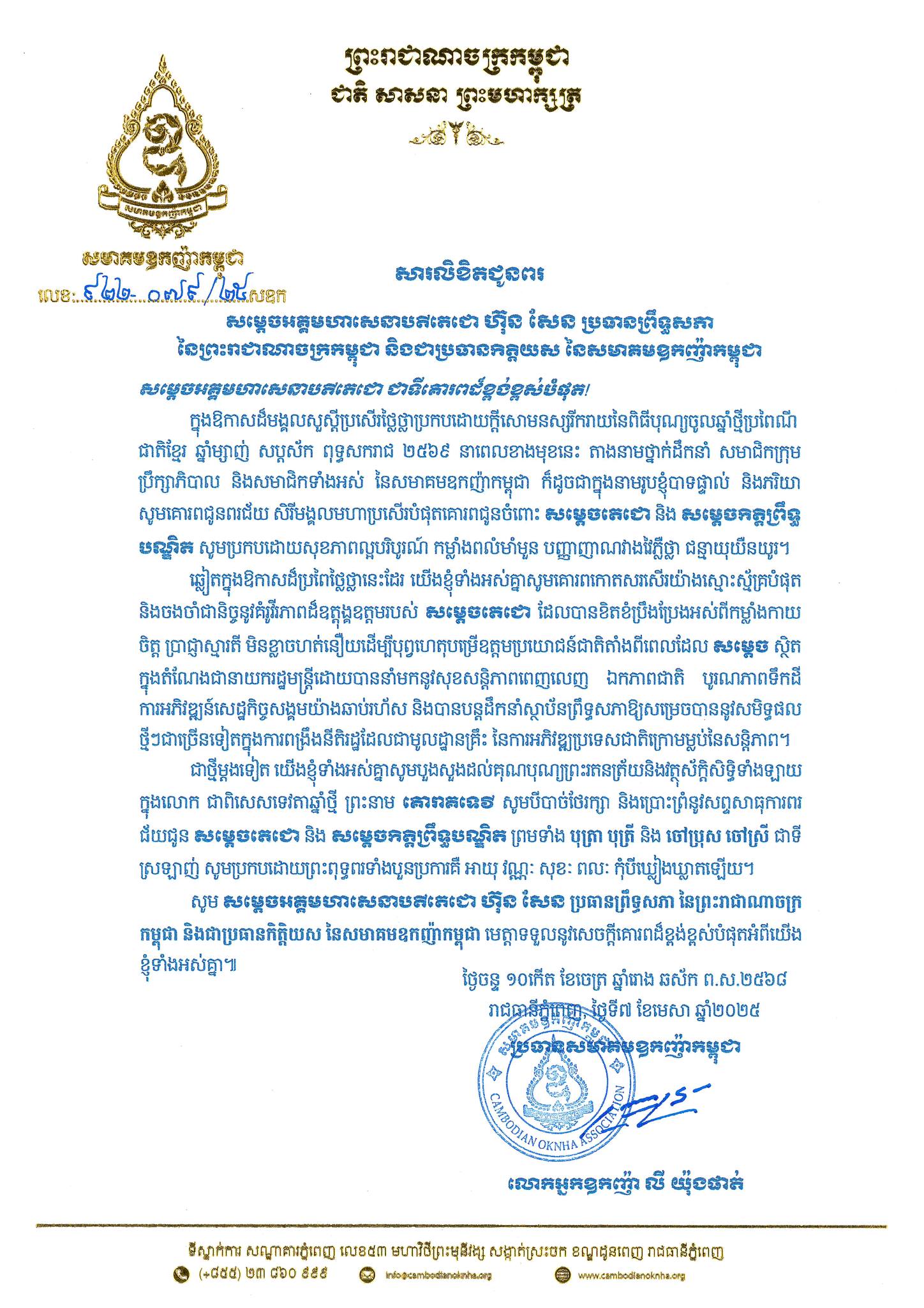 លោកអ្នកឧកញ៉ា លី យ៉ុងផាត់ ប្រធានសមាគមឧកញ៉ាកម្ពុជា និងលោកជំទាវ ព្រមទាំងលោកអ្នកឧកញ៉ា អ្នកឧកញ៉ា ឧកញ៉ា ជាអនុប្រធាន សមាជិកក្រុមប្រឹក្សាភិបាល ក៏ដូចជាសមាជិកទាំងអស់ នៃសមាគមឧកញ៉ាកម្ពុជា សូមផ្ញើសារលិខិតគោរពជូនពរ សម្តេចអគ្គមហាសេនាបតីតេជោ ហ៊ុន សែន ប្រធានព្រឹទ្ធសភា នៃព្រះរាជាណាចក្រកម្ពុជា និងជាប្រធានកិត្តិយសសមាគមឧកញ៉ាកម្ពុជា ជាទីគោរពដ៏ខ្ពង់ខ្ពស់បំផុត ក្នុងឱកាសដ៏មហានក្ខត្តឫក្សថ្លៃថ្លាប្រកបដោយក្តីសោមនស្សរីករាយបំផុត នៃពិធីបុណ្យចូលឆ្នាំថ្មីប្រពៃណីជាតិខ្មែរ ឆ្នាំម្សាញ់ សប្តស័ក ពុទ្ធសករាជ ២៥៦៩ នាពេលខាងមុខនេះ។