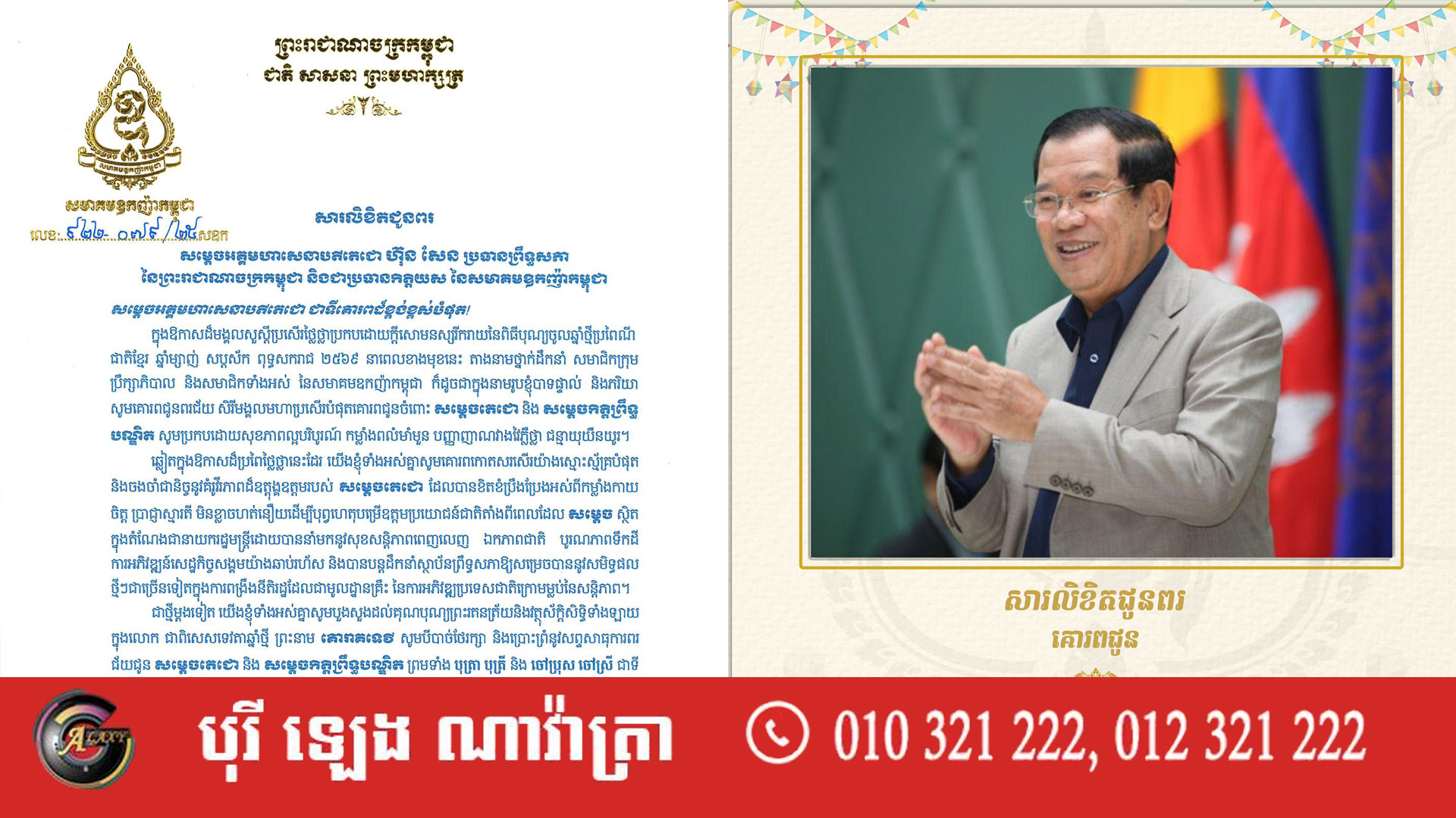 ជាថ្មីម្តងទៀត យើងខ្ញុំទាំងអស់គ្នា សូមបួងសួងដល់គុណព្រះរតនត្រ័យ វត្ថុស័ក្តិសិទ្ធិទាំងឡាយក្នុងលោក ជាពិសេសទេវតាឆ្នាំថ្មី ព្រះនាម គោរាគទេវ សូមបីបាច់ថែរក្សា និងប្រោះព្រំនូវព្រះរាជសព្ទសាធុការពរជ័យជូន សម្តេចតេជោ និងសម្តេចកិត្តិព្រឹទ្ធបណ្ឌិត ព្រមទាំង បុត្រា បុត្រី និងចៅប្រុស ចៅស្រី ជាទីស្រឡាញ់ សូមប្រកបដោយព្រះពុទ្ធពរទាំងបួនប្រការគឺ អាយុ វណ្ណៈ សុខៈ ពលៈ កុំបីឃ្លៀងឃ្លាតឡើយ៕
