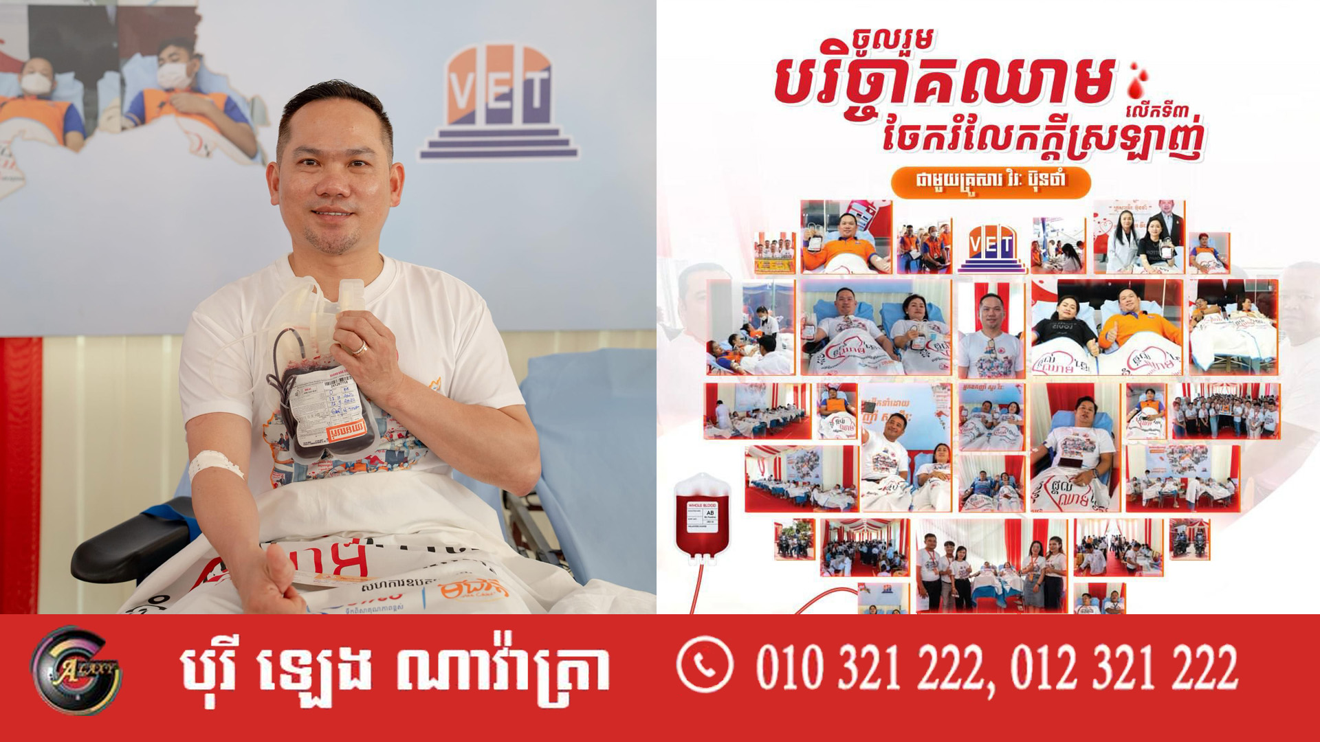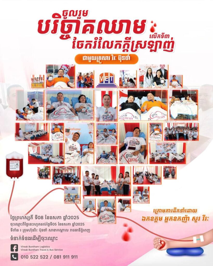 អ្នកឧកញ៉ា សួរ វីរៈ អគ្គនាយកក្រុមហ៊ុន វិរៈ ប៊ុនថាំ អេចប្រេស បានប្រកាសរៀបចំកម្មវិធីបរិច្ចាគឈាមចែករំលែកក្តីស្រឡាញ់ លើកទី៣ ជាមួយគ្រួសារ វិរៈ ប៊ុនថាំ នៅថ្ងៃទី០៨ ខែឧសភា ឆ្នាំ២០២៥ ខាងមុខនេះ។