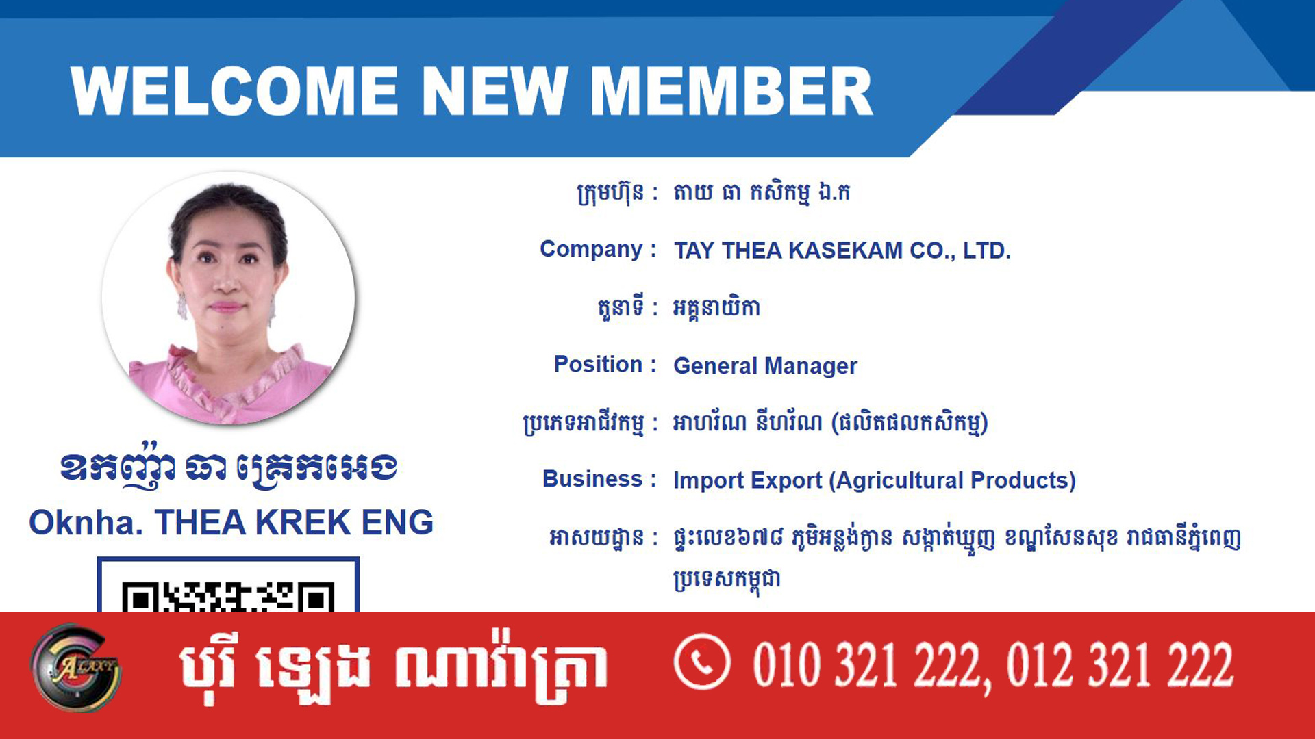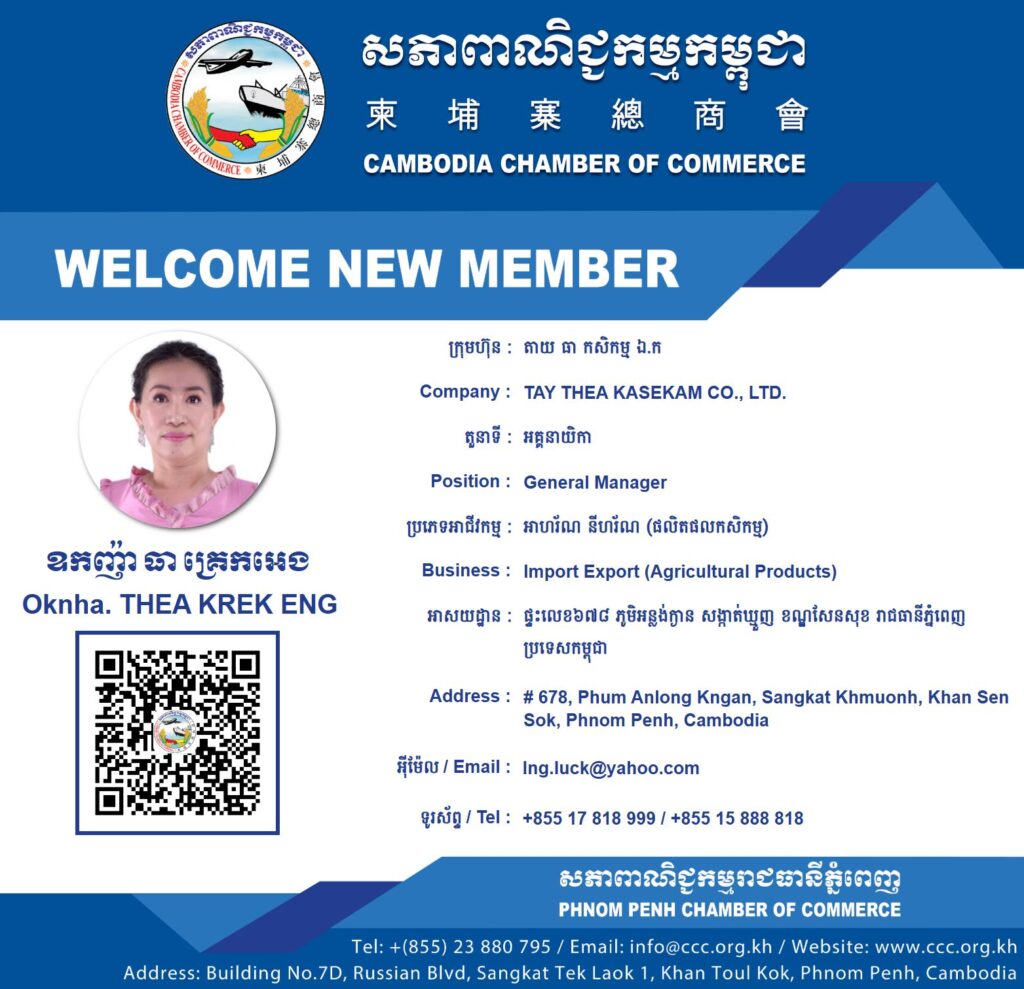 ឧកញ៉ា ធា គ្រេកអេង អគ្គនាយិកាក្រុមហ៊ុន តាយ ធា កសិកម្ម ឯ.ក បានក្លាយជាសមាជិកថ្មី នៃសភាពាណិជ្ជកម្មកម្ពុជា។ នេះបើតាមសេចក្តីប្រកាសព័ត៌មានរបស់សភាពាណិជ្ជកម្មកម្ពុជា នៅថ្ងៃទី០៨ ខែឧសភា ឆ្នាំ២០២៥។