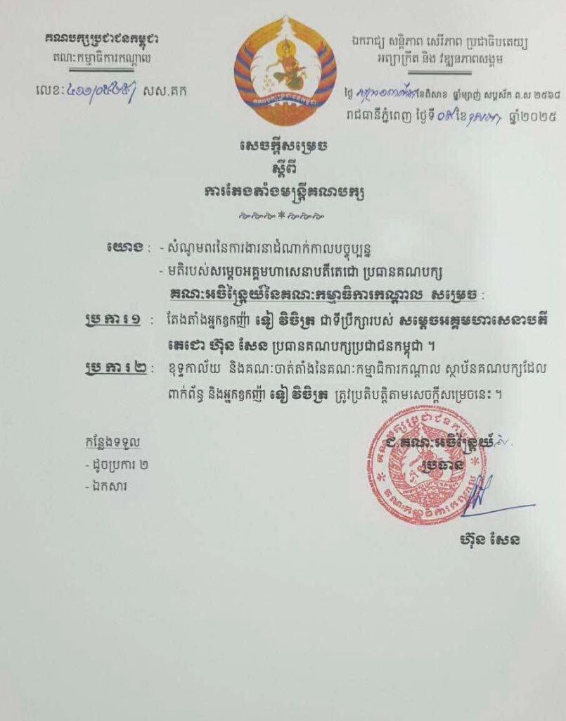 អ្នកឧកញ៉ា ទៀ វិចិត្រ អគ្គនាយកក្រុមហ៊ុន ជីធីវីសុី គ្រុប និងជាសមាជិកសមាគមឧកញ៉ាកម្ពុជា ទទួលការតែងតាំងជា ទីប្រឹក្សាសម្តេចតេជោ ហ៊ុន សែន ប្រធានគណបក្សប្រជាជនកម្ពុជា។ នេះបើតាមសេចក្តីសម្រេច ចុះថ្ងៃទី០៩ ខែឧសភា ឆ្នាំ២០២៥ របស់គណកម្មាធិការកណ្តាល គណបក្សប្រជាជនកម្ពុជា។