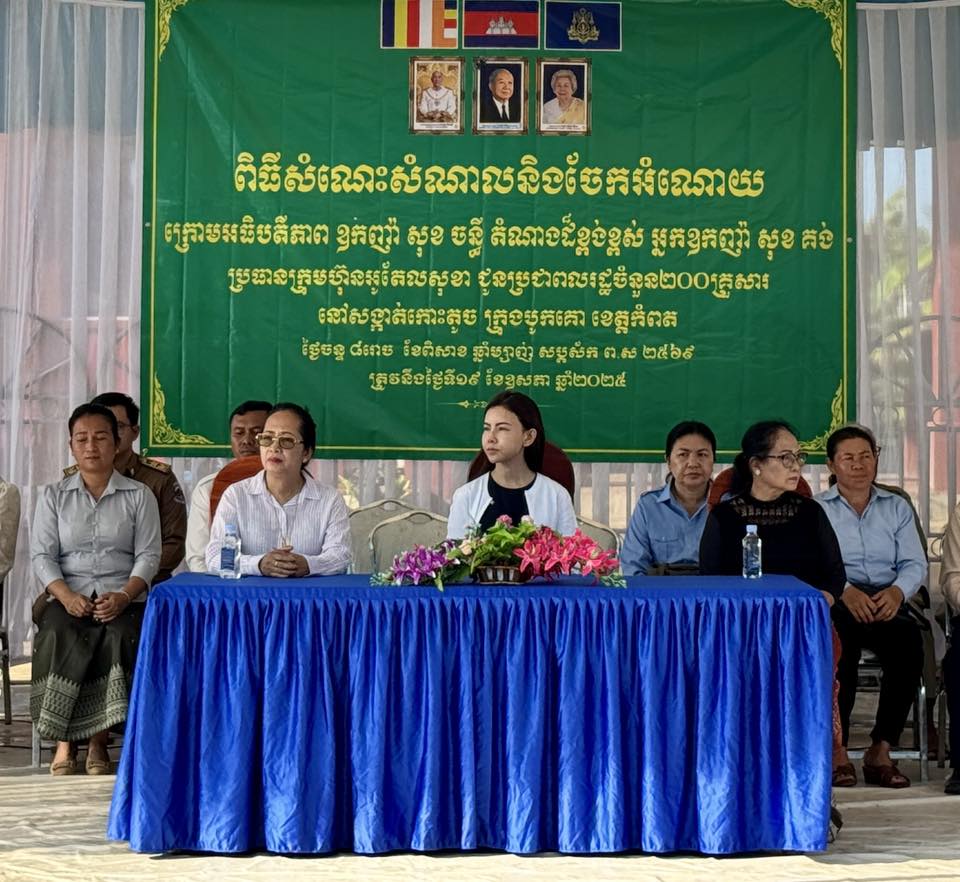 ឧកញ៉ា សុខ ចន្ធី តំណាងដ៏ខ្ពង់ខ្ពស់អ្នកឧកញ៉ា សុខ គង់ ប្រធានក្រុមហ៊ុន សុខា អូតែល នាព្រឹកថ្ងៃទី១៩ ខែឧសភា ឆ្នាំ២០២៥ បានដឹកនាំក្រុមការងារចុះសំណេះសំណាលនិងចែកអំណោយ ជូនប្រជាពលរដ្ឋដែលខ្វះខាតចំនួន ៤០០គ្រួសារ នៅសង្កាត់កោះតូច និងសង្កាត់ព្រែកត្នោត ក្រុងបូកគោ ខេត្តកំពត។