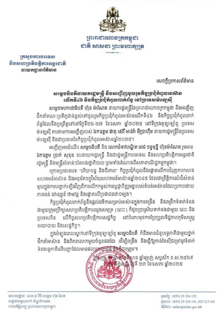 ក្រសួងការបរទេស និងសហប្រតិបត្តិការអន្តរជាតិ បានបញ្ជាក់ថា ដំណើរអញ្ជើញចូលរួមកិច្ចប្រជុំកំពូលអាស៊ាន និងកិច្ចប្រជុំកំពូលពាក់ព័ន្ធនេះ ធ្វើឡើងតបតាមការអញ្ជើញរបស់លោក ដាតុ ស៊េរី អាន់វ៉ា ស៊ីប្រាហ៊ីម នាយករដ្ឋមន្ត្រីម៉ាឡេស៊ី និងជាប្រធានកិច្ចប្រជុំកំពូលអាស៊ានឆ្នាំ២០២៥។