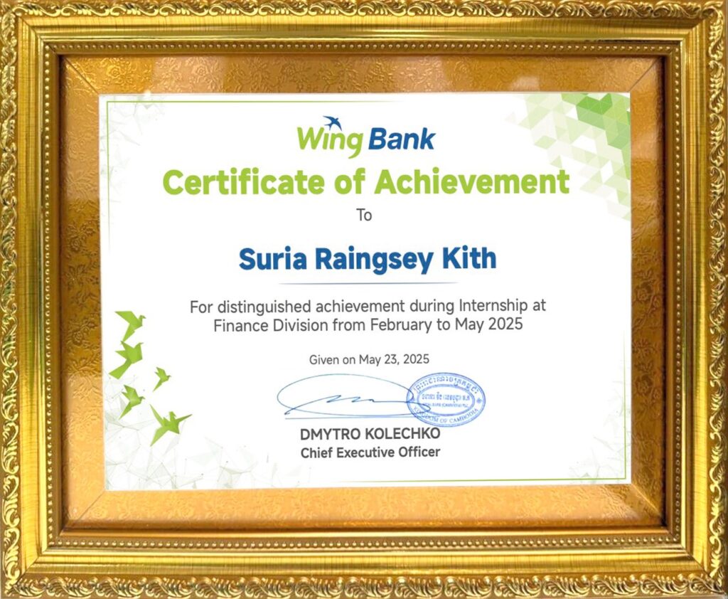 កញ្ញា គិត ស៊ូរៀ រង្សី កូនស្រីច្បងរបស់ អ្នកឧកញ៉ា គិត ម៉េង ប្រធានសភាពាណិជ្ជកម្មកម្ពុជា និងជាប្រធានក្រុមប្រឹក្សាភិបាលក្រុមហ៊ុន រ៉ូយ៉ាល់ គ្រុប បានបញ្ចប់កម្មសិក្សារយៈពេល ៣ខែ ដោយជោគជ័យ នៅធនាគារ វីង កាលពីថ្ងៃទី២៣ ខែឧសភា ឆ្នាំ២០២៥។