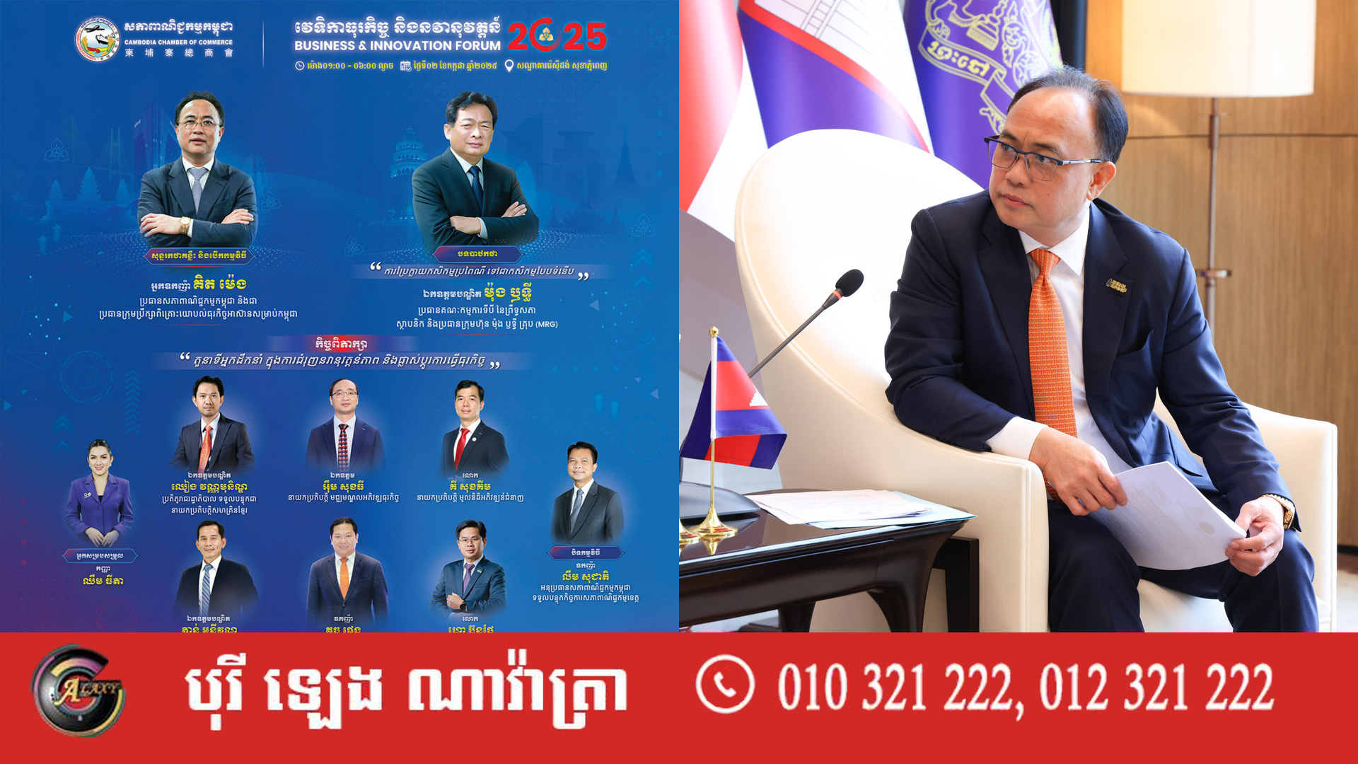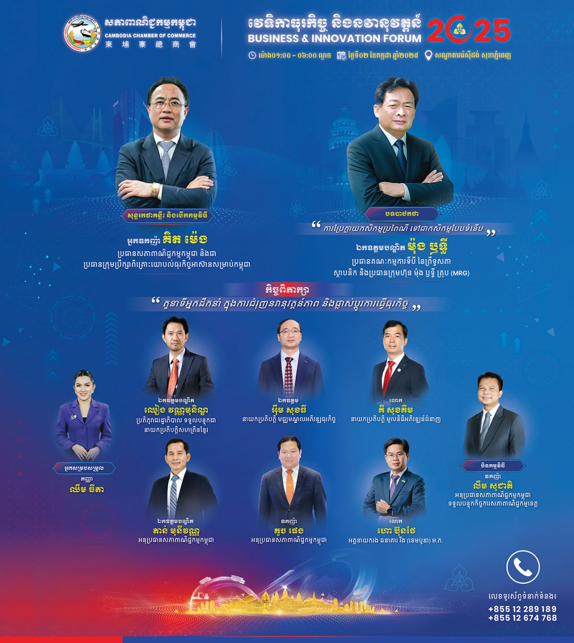 អ្នកឧកញ៉ា គិត ម៉េង ប្រធានសភាពាណិជ្ជកម្មកម្ពុជា និងប្រធានក្រុមប្រឹក្សាពិគ្រោះយោបល់ធុរកិច្ចអាស៊ានសម្រាប់កម្ពុជា នឹងអញ្ជើញជាអធិបតីថ្លែងសុន្ទរកថាគន្លឹះក្នុងពិធីបើកវេទិកាធុរកិច្ច និងនវានុវត្តន៍ ឆ្នាំ២០២៥ ដើម្បីជំរុញនិងលើកកម្ពស់បរិយាកាសនៃការច្នៃប្រឌិតនិងនវានុវត្តន៍ក្នុងវិស័យធុរកិច្ច នារសៀលថ្ងៃទី០២ ខែកក្កដា ឆ្នាំ២០២៥ ខាងមុខនេះ នៅសណ្ឋាគារ រ៉េស៊ីដង់ សុខាភ្នំពេញ។