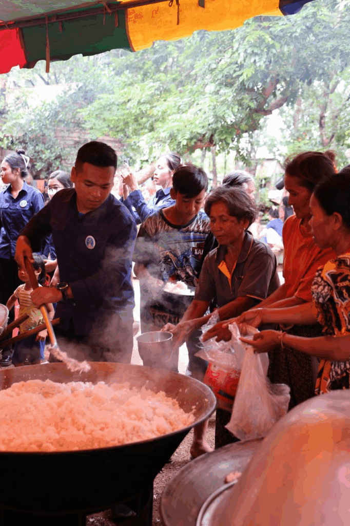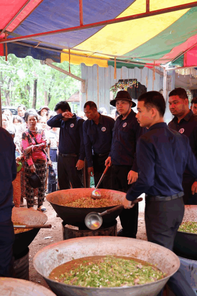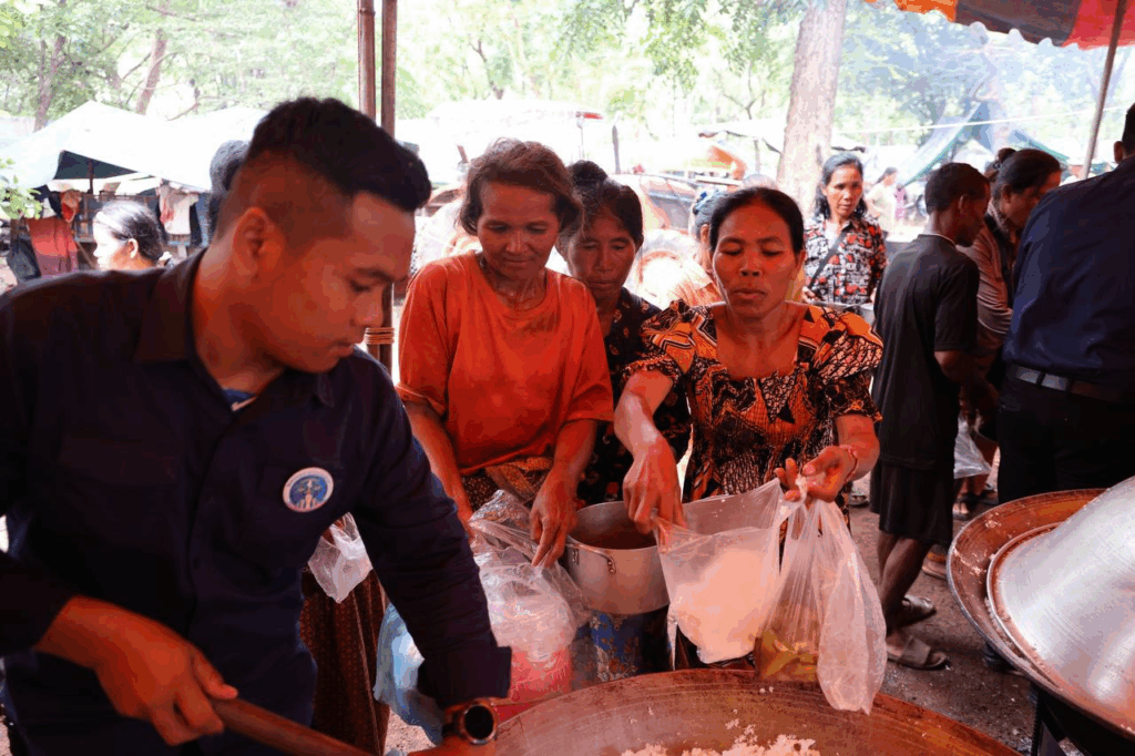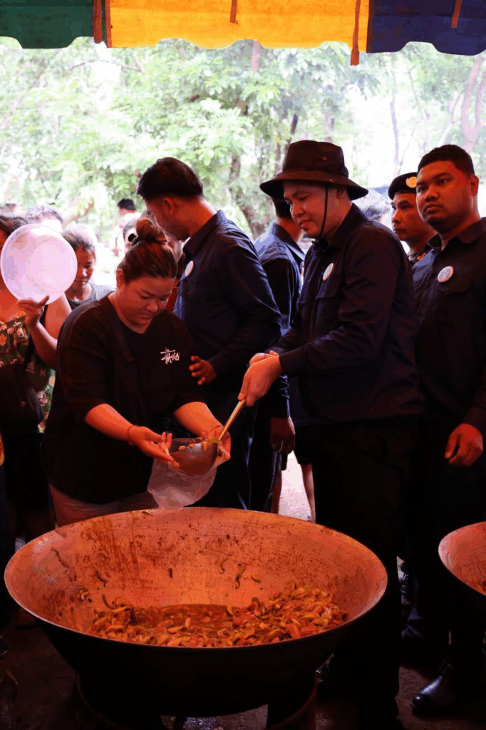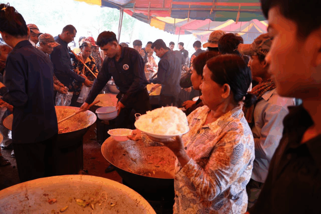 ក្រោយក្រុមការងារដាំបាយ និងចម្អិនម្ហូបឆ្អិនរួចរាល់មក ឯកឧត្តមកិត្តិសង្គហបណ្ឌិត គន់ គីម ទេសរដ្ឋមន្រ្តី អនុប្រធានទី១ គណៈកម្មាធិការជាតិគ្រប់គ្រងគ្រោះមហន្តរាយ និងអ្នកឧកញ៉ា ឡេង ណាវ៉ាត្រា បានរៀបចំដួសជូនដោយផ្ទាល់ដៃតែម្តង បង្ហាញពីការសាមគ្គីភាពគ្នាជាធ្លុងមួយ ក្នុងមហាគ្រួសារខ្មែរ។