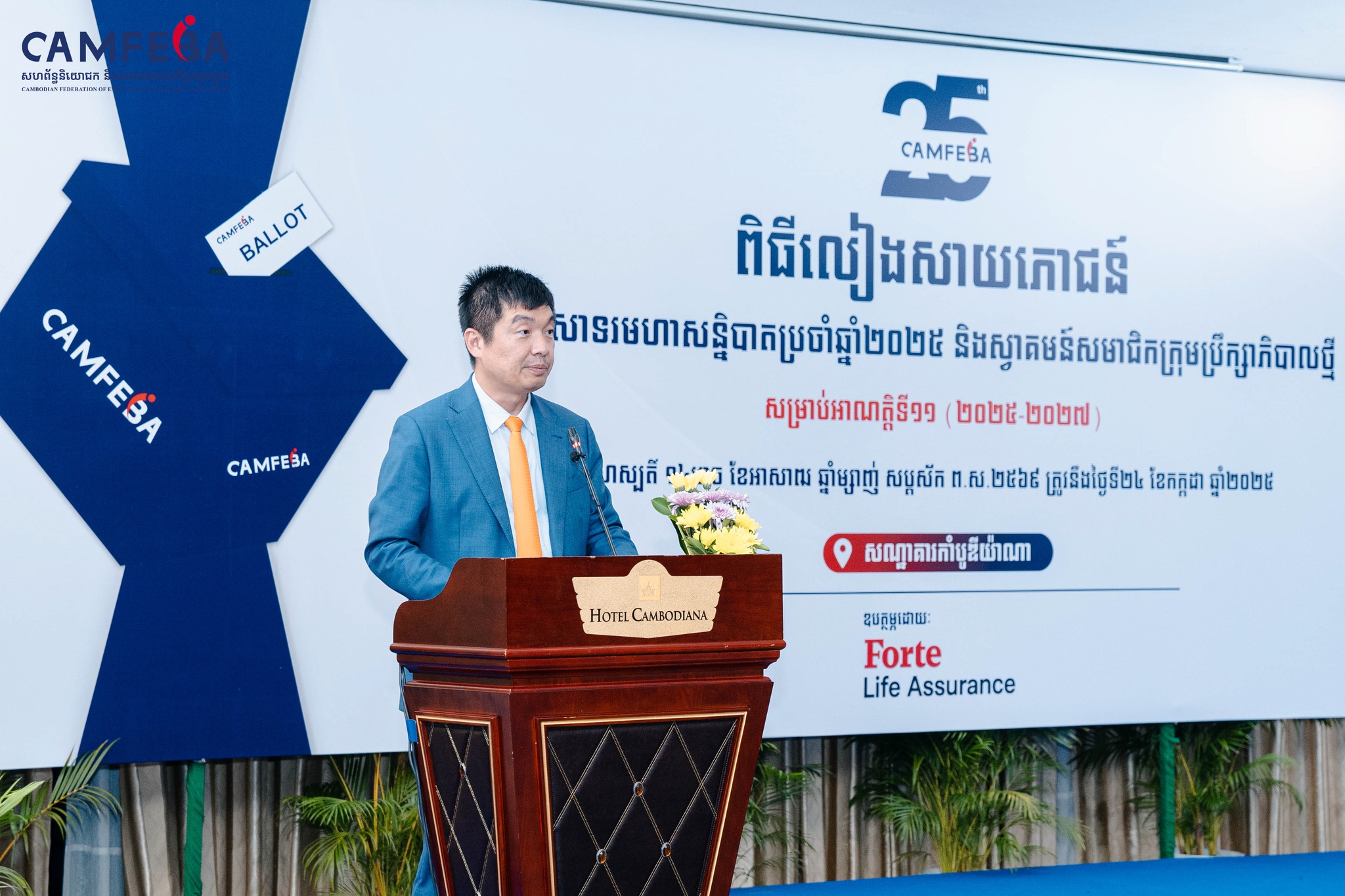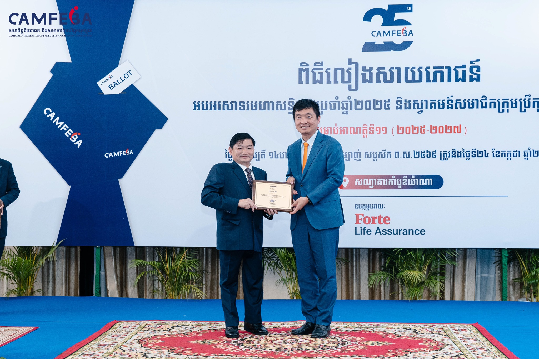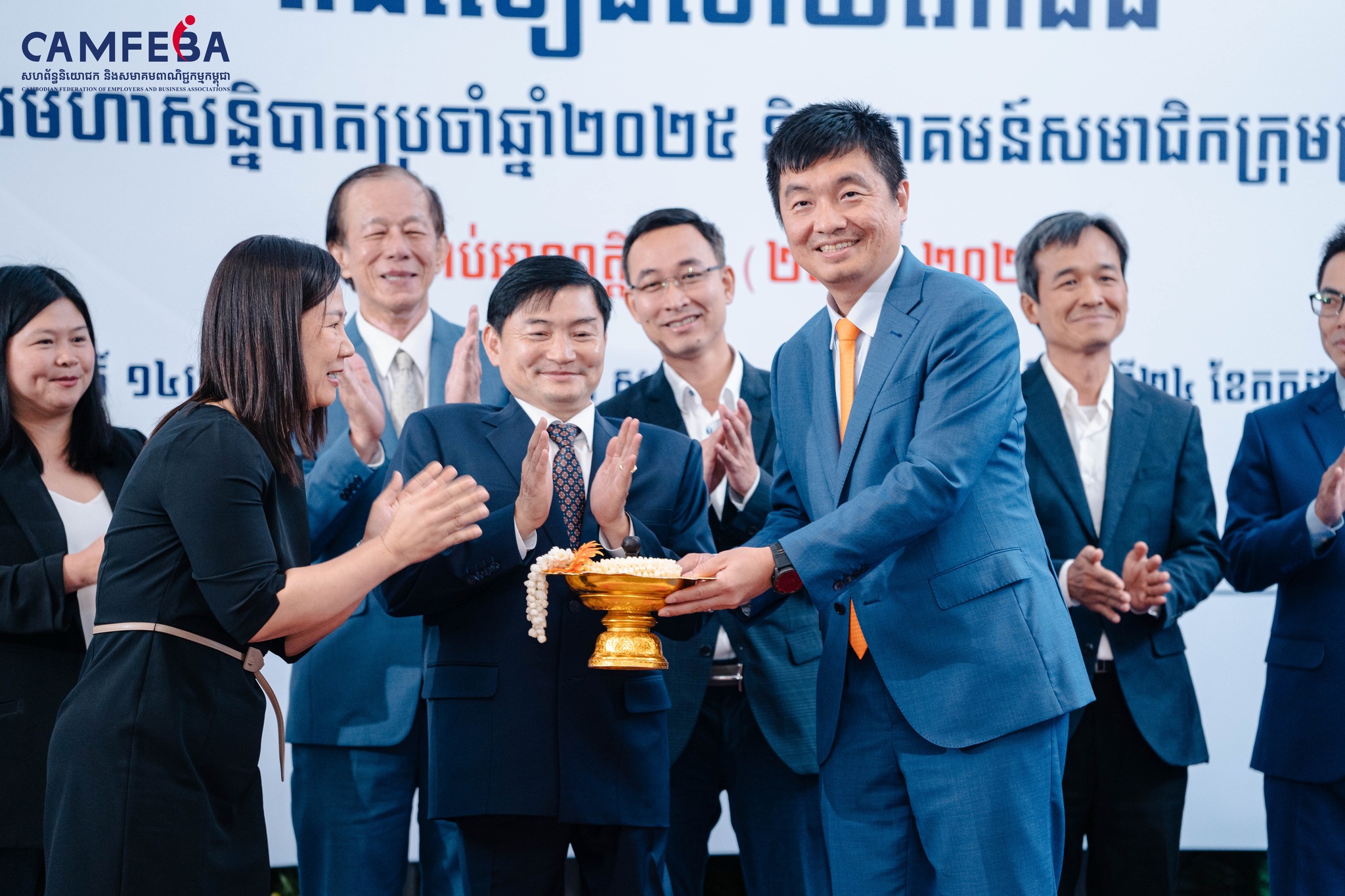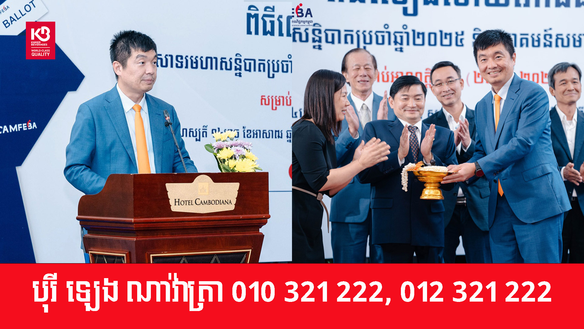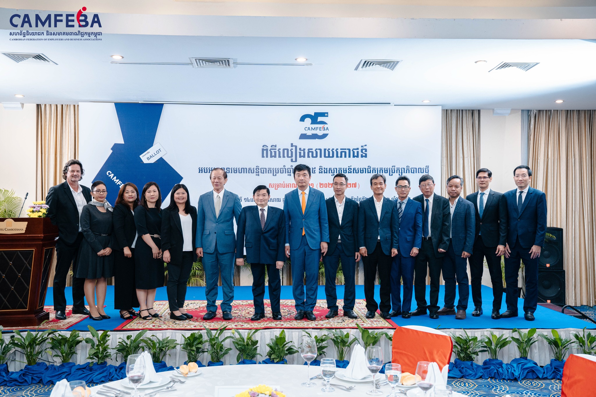 ពិធីប្រគល់ត្រាជូនប្រធានក្រុមប្រឹក្សាភិបាលអាណត្តិថ្មី CAMFEBA និងពិធីលៀងសាយភោជន៍អបអរសាទរមហាសនិ្នបាតប្រចាំឆ្នាំ បានប្រារព្វធ្វើឡើងកាលល្ងាចថ្ងៃទី២៤ ខែកក្កដា ឆ្នាំ២០២៥ ក្រោមអធិបតីភាព ឯកឧត្តម ហេង សួរ រដ្ឋមន្រ្តីក្រសួងការងារ និងបណ្តុះបណ្តាលវិជ្ជាជីវៈ ព្រមទាំង ឯកឧត្តម លោកជំទាវ លោក លោកស្រី ដែលជាតំណាងក្រសួង និងថា្នក់ដឹកនាំនៃបណ្តាសហគ្រាស-គ្រឹះស្ថាន អង្គការក្រៅរដ្ឋាភិបាល សហជីព និងសមាគមពាណិជ្ជកម្មនានានៅក្នុងប្រទេសប្រមាណជា ២០០នាក់។