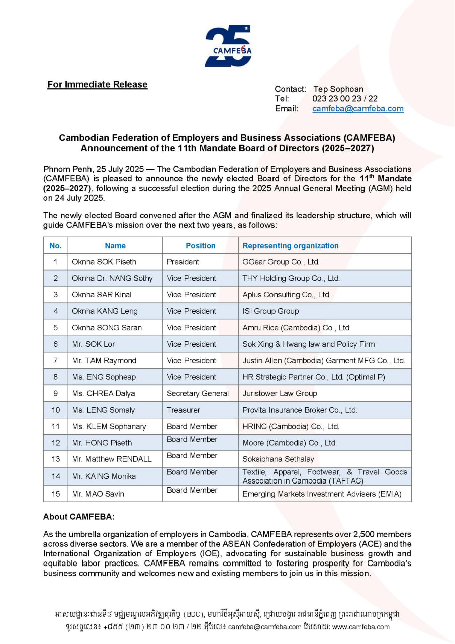សូមជម្រាបថា ក្រុមប្រឹក្សាភិបាលរបស់ CAMFEBA សម្រាប់អាណត្តិទី១១ ថ្មីនេះ គឺមានសមាសភាពដូចជា៖ ឧកញ៉ា សុខ ពិសិដ្ឋ ជាប្រធាន, ឧកញ៉ា ណាង សុធី, ឧកញ៉ា ស គីណាល់, ឧកញ៉ា កាង ឡេង, ឧកញ៉ា សុង សារ៉ន និងលោក-លោកស្រី ជាអនុប្រធាន ចំនួន ៧រូប ព្រមទាំងសមាជិក សមាជិកាក្រុមប្រឹក្សាភិបាល ចំនួន ៧រូបផ្សេងទៀត សរុបទាំងអស់ចំនួន ១៥រូប។ CAMFEBA អាណត្តិទី១១ មានរយៈពេល ៣ឆ្នាំ ចាប់ពីឆ្នាំ២០២៥ ដល់ឆ្នាំ២០២៧៕