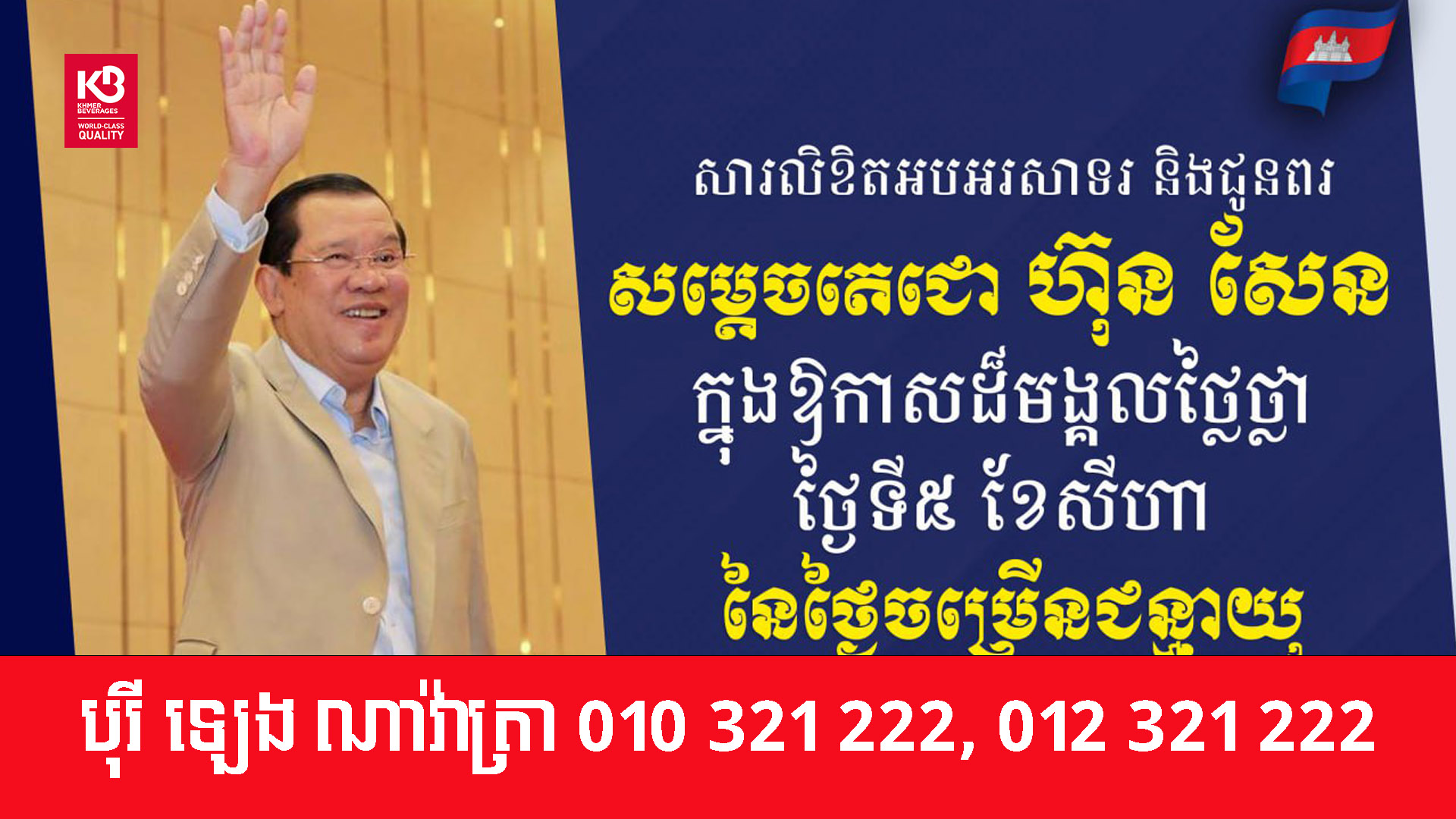 យើងខ្ញុំសូមអនុញ្ញាតចូលរួមសម្តែង នូវសេចក្តីអំណរសាទរឥតឧបមា ជូននូវសព្ទសាធុការពរ បវរសួស្តី សិរីមង្គល វិបុលសុខ មហាប្រសើរគ្រប់ប្រការ ជូនចំពោះសម្តេចតេជោ និងសម្តេចកិត្តិព្រឹទ្ធបណ្ឌិត ប្រកបដោយមនោសញ្ចេតនា គោរពស្រឡាញ់ដ៏ជ្រាលជ្រៅ និងកតញ្ញូកតវេទីតាធម៌យ៉ាងស្មោះស្ម័គ្របំផុត ចំពោះកិច្ចខិតខំប្រឹងប្រែង យកអស់កម្លាំងកាយចិត្ត ប្រាជ្ញាស្មារតី និងបទពិសោធន៍ ប្រកបដោយគតិបណ្ឌិត ក្នុងការដឹកនាំនាវាកម្ពុជាទទួលបាននូវសុខសន្តិភាពពេញលេញ។