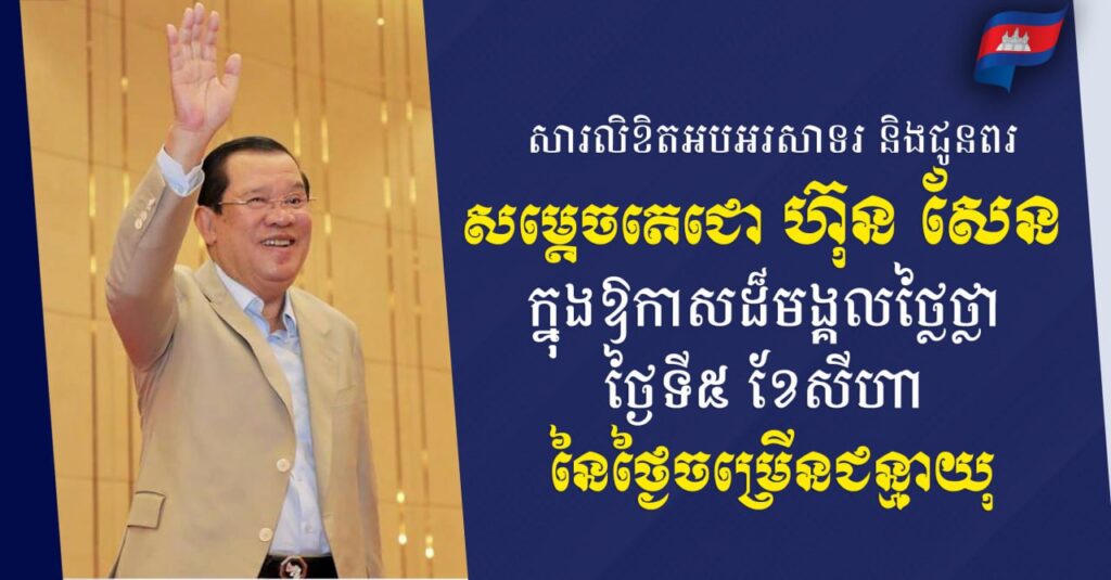យើងខ្ញុំសូមអនុញ្ញាតចូលរួមសម្តែង នូវសេចក្តីអំណរសាទរឥតឧបមា ជូននូវសព្ទសាធុការពរ បវរសួស្តី សិរីមង្គល វិបុលសុខ មហាប្រសើរគ្រប់ប្រការ ជូនចំពោះសម្តេចតេជោ និងសម្តេចកិត្តិព្រឹទ្ធបណ្ឌិត ប្រកបដោយមនោសញ្ចេតនា គោរពស្រឡាញ់ដ៏ជ្រាលជ្រៅ និងកតញ្ញូកតវេទីតាធម៌យ៉ាងស្មោះស្ម័គ្របំផុត ចំពោះកិច្ចខិតខំប្រឹងប្រែង យកអស់កម្លាំងកាយចិត្ត ប្រាជ្ញាស្មារតី និងបទពិសោធន៍ ប្រកបដោយគតិបណ្ឌិត ក្នុងការដឹកនាំនាវាកម្ពុជាទទួលបាននូវសុខសន្តិភាពពេញលេញ។
