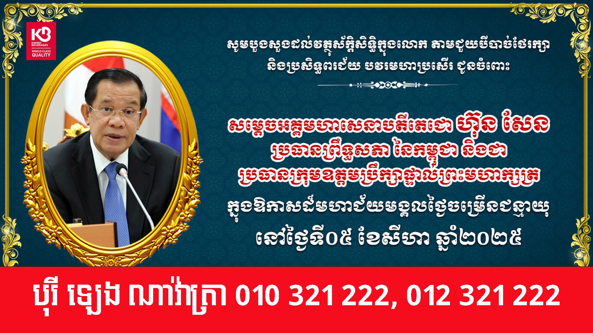 យើងខ្ញុំសូមអនុញ្ញាតចូលរួមសម្តែង នូវសេចក្តីអំណរសាទរឥតឧបមា ជូននូវសព្ទសាធុការពរ បវរសួស្តី សិរីមង្គល វិបុលសុខ មហាប្រសើរគ្រប់ប្រការ ជូនចំពោះសម្តេចតេជោ និងសម្តេចកិត្តិព្រឹទ្ធបណ្ឌិត ប្រកបដោយមនោសញ្ចេតនា គោរពស្រឡាញ់ដ៏ជ្រាលជ្រៅ និងកតញ្ញូកតវេទីតាធម៌យ៉ាងស្មោះស្ម័គ្របំផុត ចំពោះកិច្ចខិតខំប្រឹងប្រែង យកអស់កម្លាំងកាយចិត្ត ប្រាជ្ញាស្មារតី និងបទពិសោធន៍ ប្រកបដោយគតិបណ្ឌិត ក្នុងការដឹកនាំនាវាកម្ពុជាទទួលបាននូវសុខសន្តិភាពពេញលេញ។