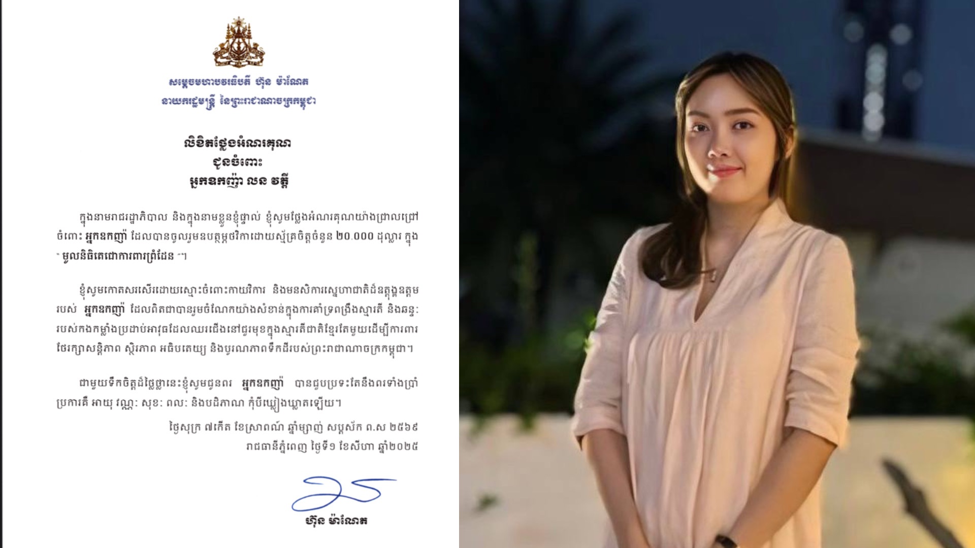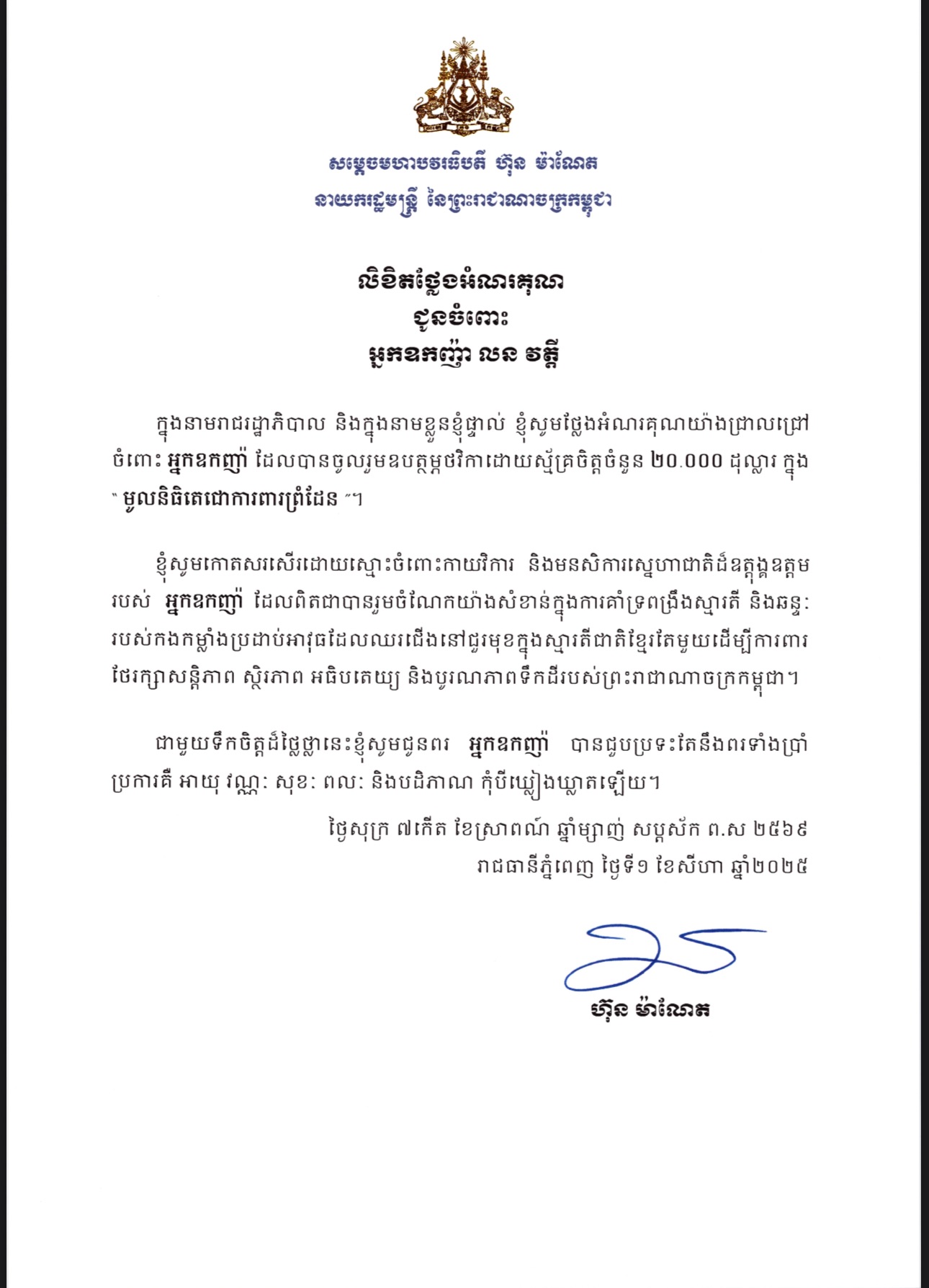 តបតាមការអំពាវនាវរបស់ សម្តេចតេជោ ហ៊ុន សែន ប្រធានព្រឹទ្ធសភា, លោកជំទាវអ្នកឧកញ៉ា លន វត្តី និងគ្រួសារ បានប្រកាសឧបត្ថម្ភថវិកា ២០,០០០ដុល្លារ (២ម៉ឺនដុល្លារ) ដល់កងទ័ពជួរមុខកម្ពុជា ដែលឈរជើងនៅបណ្តោយព្រំដែនកម្ពុជា-ថៃ។