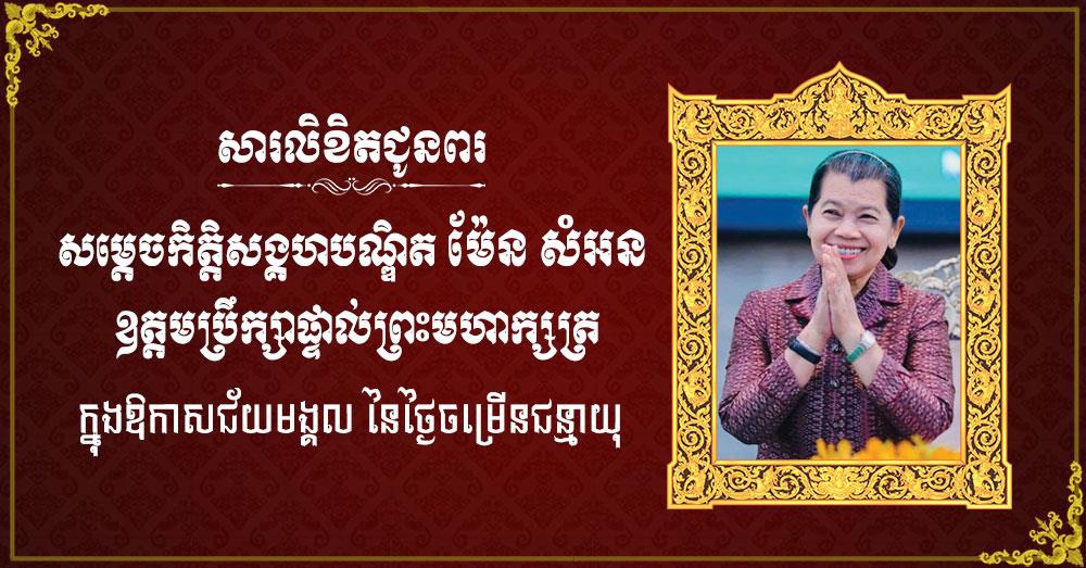 ឆ្លៀតក្នុងឱកាសនេះ យើងខ្ញុំសូមកោតសរសើរ និងវាយតម្លៃខ្ពស់ចំពោះសម្ដេចកិត្តិសង្គហបណ្ឌិត ម៉ែន សំអន ដែលជាថ្នាក់ដឹកនាំស្ត្រីមួយរូបពោរពេញទៅដោយគុណធម៌ និងគំរូវីរភាពដ៏ប្រពៃ ដែលបានយកអស់កម្លាំង កាយចិត្ត ប្រាជ្ញា ស្មារតី ក្នុងការរួមចំណែកដ៏ធំធេងក្នុងបុព្វហេតុបម្រើជាតិ មាតុភូមិ ជាពិសេស តែងតែខិតខំ ប្រឹងប្រែងលើកស្ទួយសិទ្ធិនារី ការពារអត្តសញ្ញាណជាតិ ប្រពៃណី ទំនៀមទម្លាប់ និងវប្បធម៌ជាតិដ៏ល្អផូរផង់ និងបានចូលរួមគ្រប់សកម្មភាពក្នុងទិសដៅបម្រើឧត្តមប្រយោជន៍សុខសន្តិភាព ស្ថិរភាព ភាពចម្រុងចម្រើនន ប្រទេសជាតិ និងសុខុមាលភាពប្រជាជន។