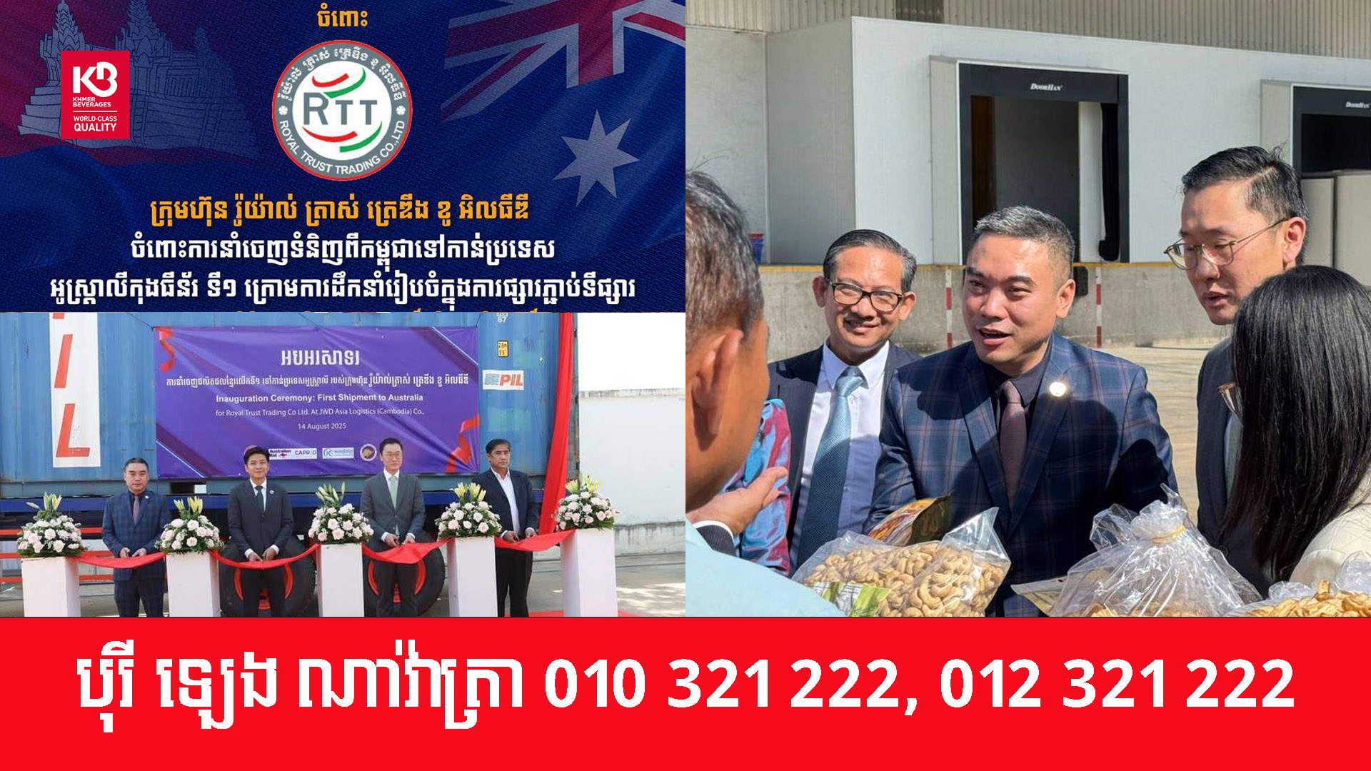 ពិធីសម្ពោធការនាំចេញផលិតផលកម្ពុជាទៅកាន់ប្រទេសអូស្រ្តាលី ក៏មានការចូលរួមពី ឯកអគ្គរដ្ឋទូតអូស្រ្តាលីប្រចាំនៅកម្ពុជា អគ្គនាយក RTT តំណាងសហគ្រិនខ្មែរ (KE) និងតំណាងវិស័យឯកជនពាក់ព័ន្ធផ្សេងទៀត។