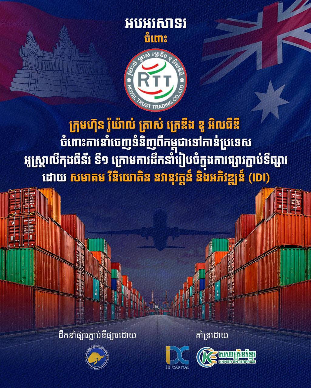 ឧកញ៉ាបណ្ឌិត ហោ សេរីវឌ្ឍន៍ ប្រធានសមាគមវិនិយោគិន នវានុវត្តន៍ និងអភិវឌ្ឍន៍ (IDI) នៅថ្ងៃទី១៤ ខែសីហា ឆ្នាំ២០២៥ បានអញ្ជើញចូលរួមពិធីសម្ពោធការនាំចេញផលិតផលកម្ពុជាទៅកាន់ប្រទេសអូស្រ្តាលី ក្រោមអធិបតីភាព ឯកឧត្តម សំហេង បូរ៉ា រដ្ឋលេខាធិការក្រសួងពាណិជ្ជកម្ម និងជាប្រធានក្រុមការងារជំរុញការនាំចេញនៃក្រសួងពាណិជ្ជកម្ម។