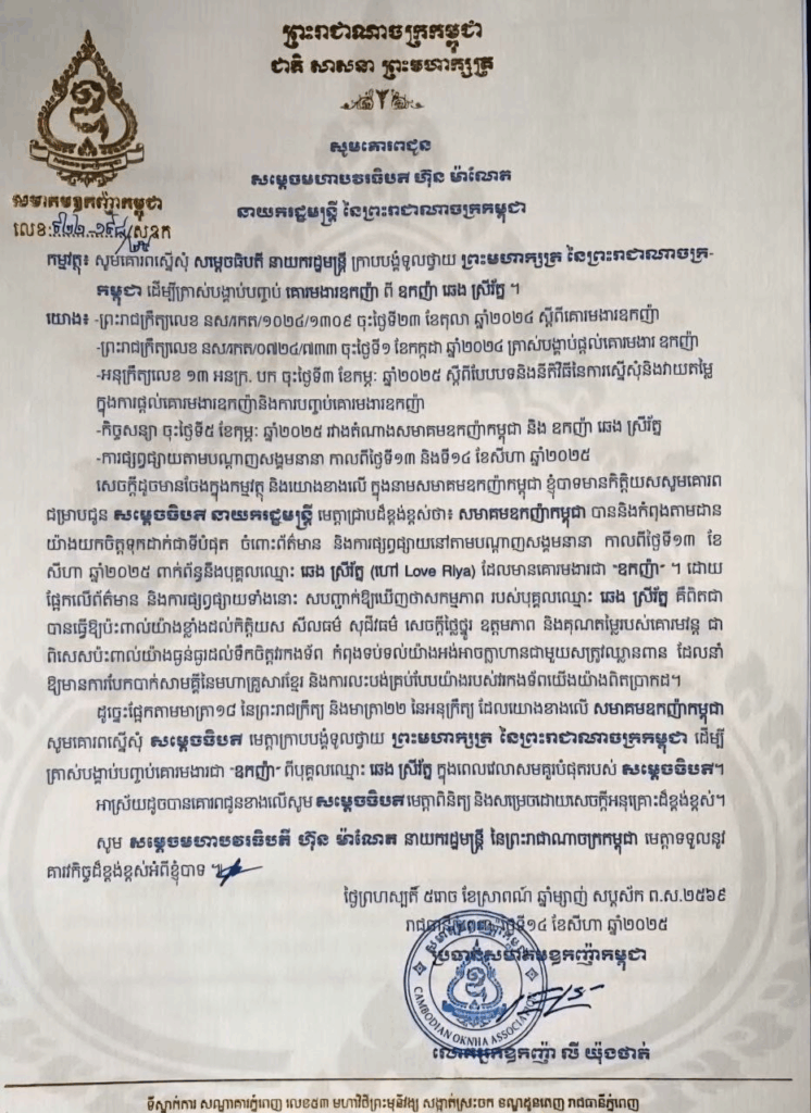 លិខិតសមាគមឧកញ៉ាកម្ពុជា ចុះថ្ងៃទី១៤ ខែសីហា ឆ្នាំ២០២៥ បានបញ្ជាក់ថា ក្នុងនាមសមាគមឧកញ៉ាកម្ពុជា លោកអ្នកឧកញ៉ា លី យ៉ុងផាត់ មានកិត្តិយសសូមគោរព ជម្រាបជូន សម្តេចធិបតី នាយករដ្ឋមន្ត្រី មេត្តាជ្រាបដ៏ខ្ពង់ខ្ពស់ថា សមាគមឧកញ៉ាកម្ពុជា បាននិងកំពុងតាមដានយ៉ាងយកចិត្តទុកដាក់ជាទីបំផុត ចំពោះព័ត៌មាន និងការផ្សព្វផ្សាយនៅតាមបណ្តាញសង្គមនានា កាលពីថ្ងៃទី១៣ ខែ សីហា ឆ្នាំ២០២៥ ពាក់ព័ន្ធនឹងបុគ្គលឈ្មោះ ឆេង ស្រីរ័ត្ន (ហៅ Love Riya) ដែលមានគោរមងារជា “ឧកញ៉ា” ។