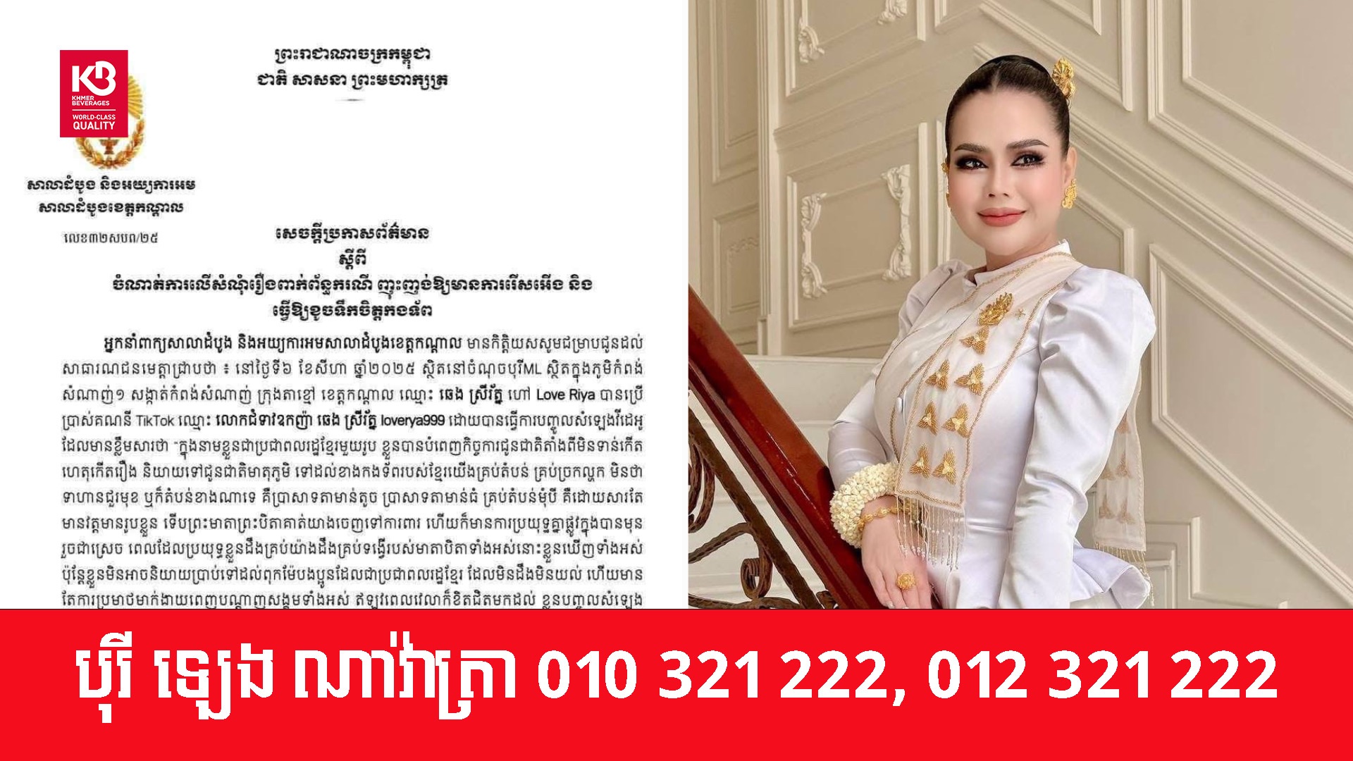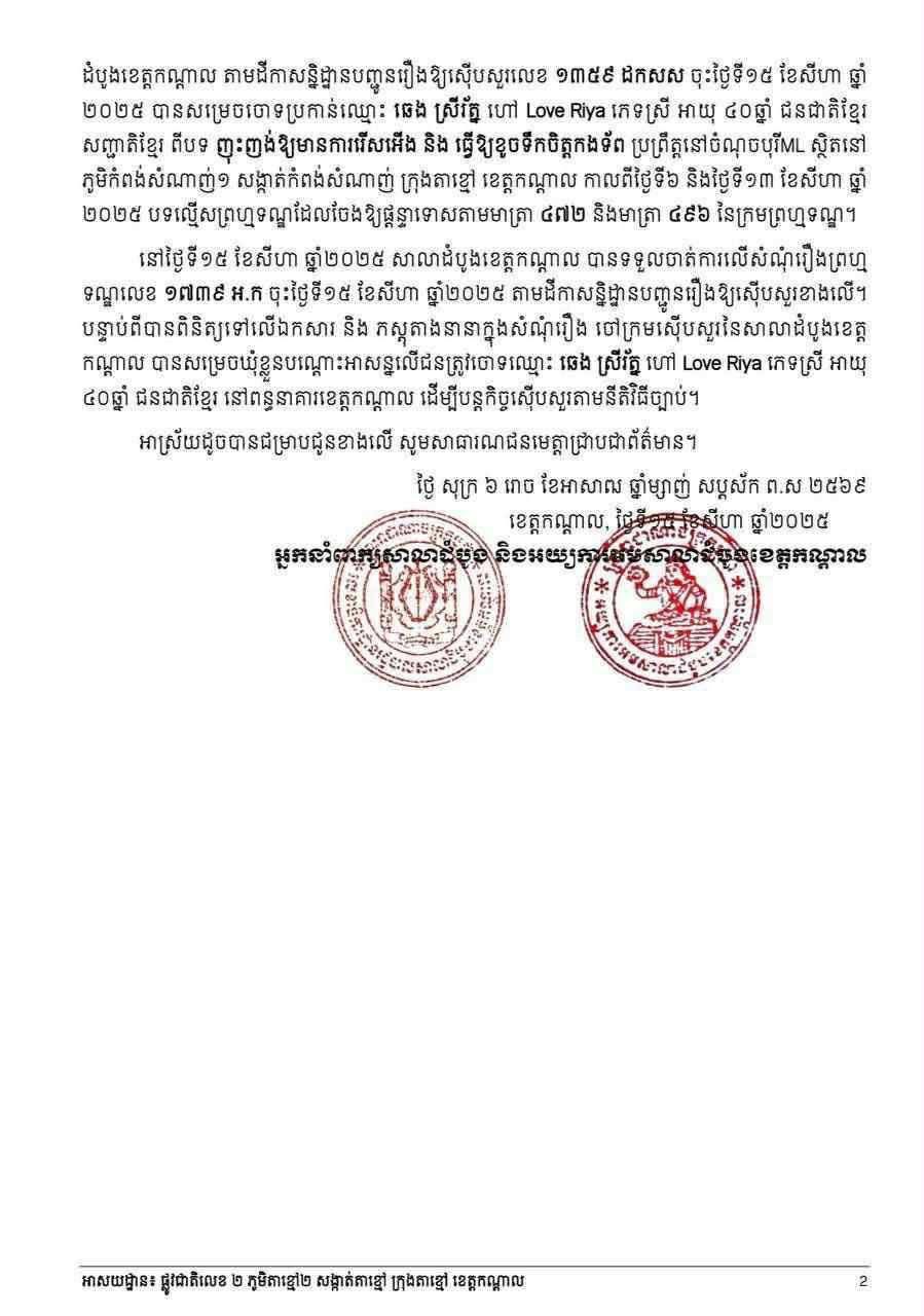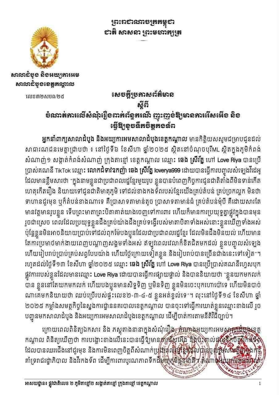 សេចក្តីប្រកាសព័ត៌មាន បានបញ្ជាក់ថា តាមដីកាសន្និដ្ឋានបញ្ជូនរឿងឱ្យស៊ើបសួរ ចុះថ្ងៃទី១៥ ខែសីហា ឆ្នាំ២០២៥ បានសម្រេចចោទប្រកាន់ឈ្មោះ ឆេង ស្រីរ័ត្ន ហៅ Love Riya ភេទស្រី អាយុ ៤០ឆ្នាំ ជនជាតិខ្មែរ សញ្ជាតិខ្មែរ ពីបទ ញុះញង់ឱ្យមានការរើសអើង និងធ្វើឱ្យខូចទឹកចិត្តកងទ័ព ប្រព្រឹត្តនៅចំណុចបុរី ML ស្ថិតនៅ ភូមិកំពង់សំណាញ់១ សង្កាត់កំពង់សំណាញ់ ក្រុងតាខ្មៅ ខេត្តកណ្តាល កាលពីថ្ងៃទី៦ និងថ្ងៃទី១៣ ខែសីហា ឆ្នាំ ២០២៥ បទល្មើសព្រហ្មទណ្ឌដែលចែងឱ្យផ្តន្ទាទោសតាមមាត្រា ៤៧២ និងមាត្រា ៤៩៦ នៃក្រមព្រហ្មទណ្ឌ។