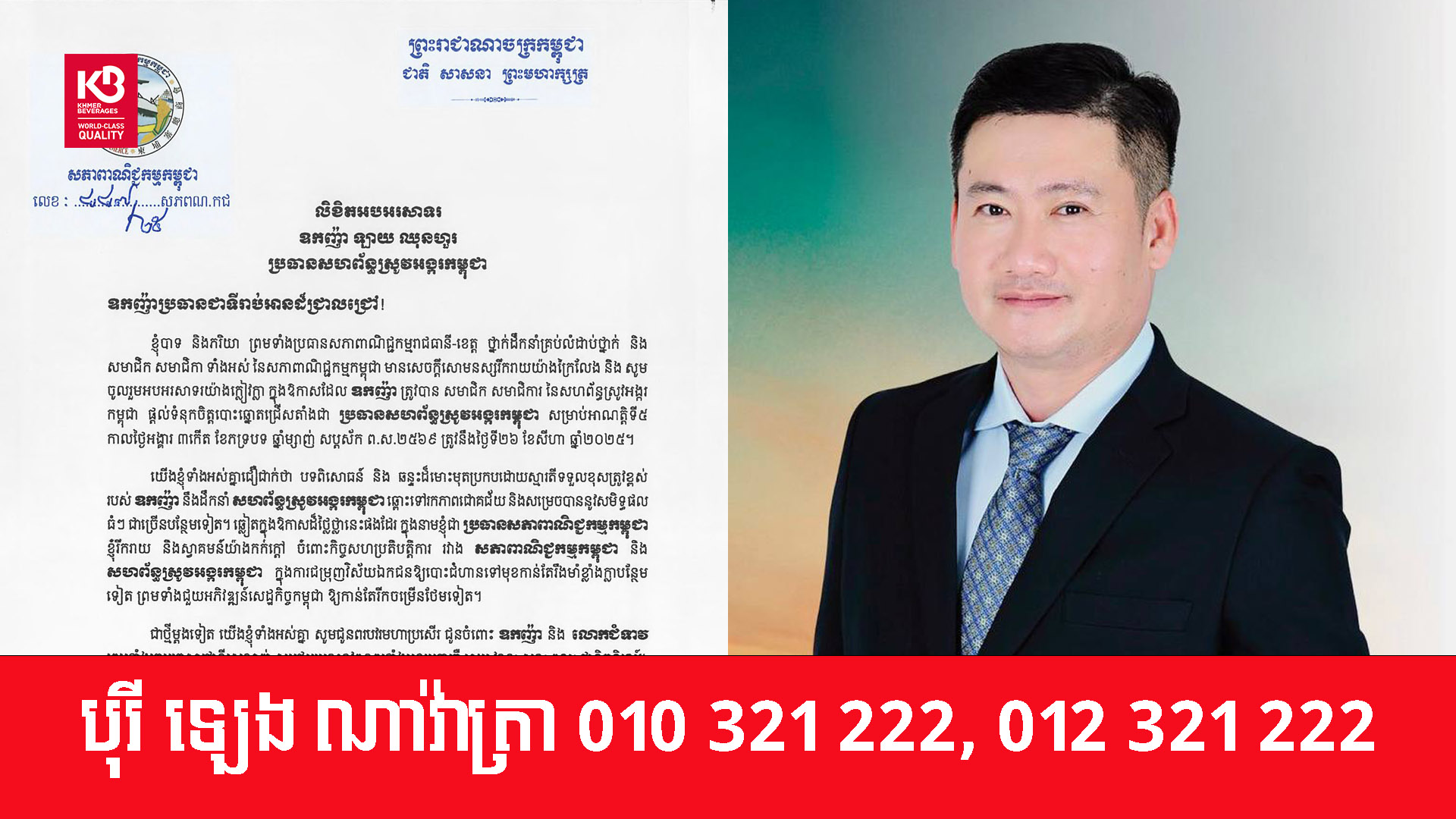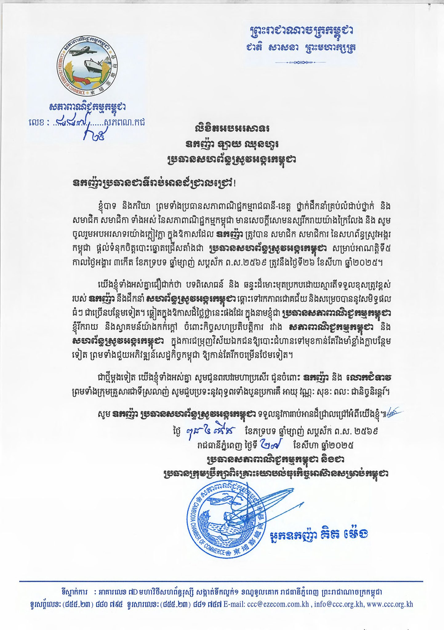 អ្នកឧកញ៉ា គិត ម៉េង ប្រធានសភាពាណិជ្ជកម្មកម្ពុជា និងជាប្រធានក្រុមប្រឹក្សាពិគ្រោះយោបល់ធុរកិច្ចអាស៊ានសម្រាប់កម្ពុជា នៅថ្ងៃទី២៧ ខែសីហា ឆ្នាំ២០២៥នេះ បានផ្ញើសារលិខិតអបអរសាទរ ឧកញ៉ា ឡាយ ឈុនហួរ ដែលបានទទួលសំឡេងគាំទ្រពីសមាជិក សមាជិកា ផ្តល់ទំនុកចិត្តបោះឆ្នោតជ្រើសតាំងជា ប្រធានសហព័ន្ធស្រូវអង្ករកម្ពុជា អាណត្តិទី៥ កាលថ្ងៃអង្គារ ទី២៦ ខែសីហា ឆ្នាំ២០២៥។