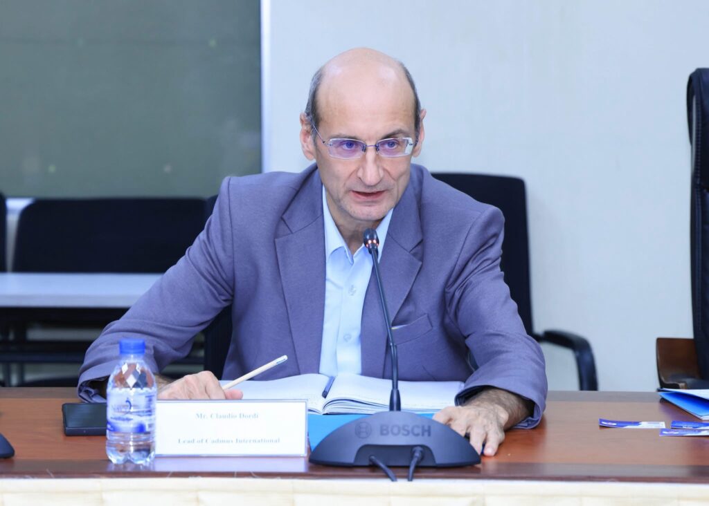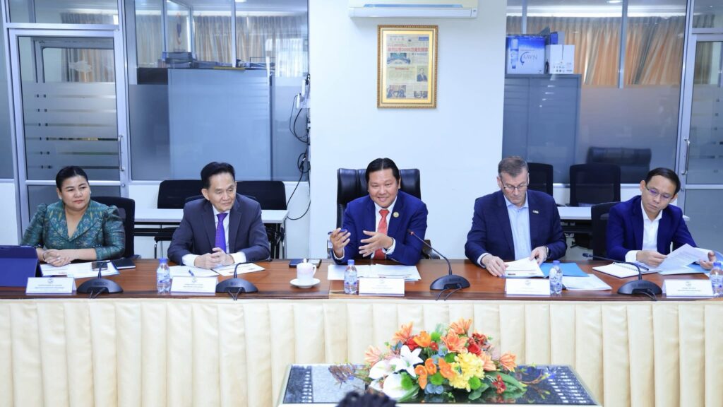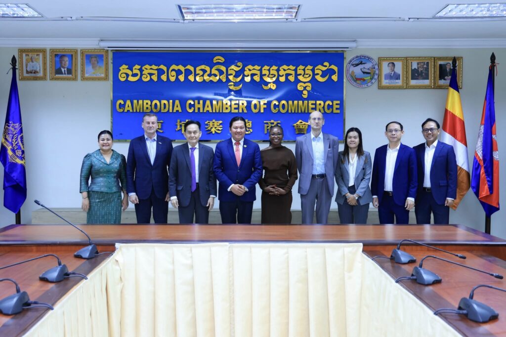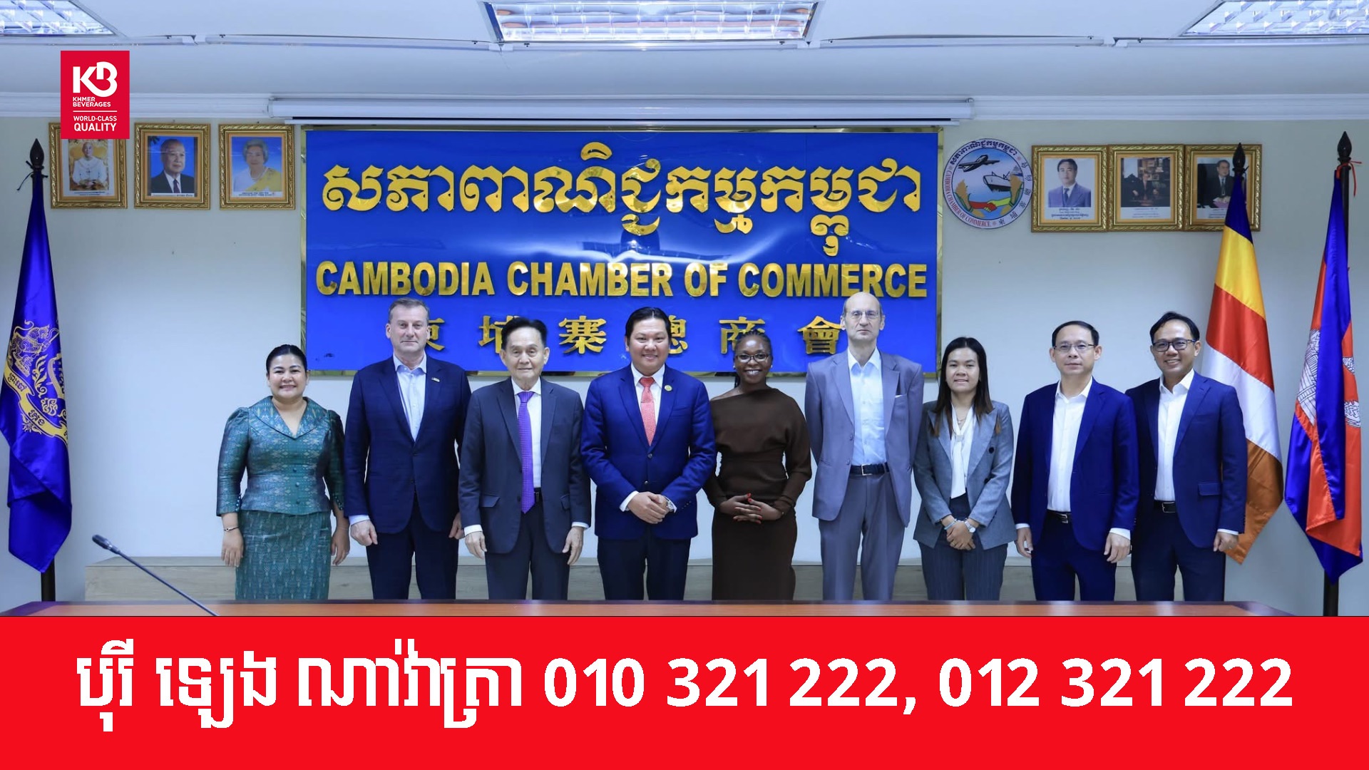 រាជធានីភ្នំពេញ៖ នារសៀលថ្ងៃពុធ ទី២៦ ខែសីហា ឆ្នាំ២០២៥ ឧកញ៉ា គួច ផេង អនុប្រធានសភាពាណិជ្ជកម្មកម្ពុជា តំណាង អ្នកឧកញ៉ា គិត ម៉េង ប្រធានសភាពាណិជ្ជកម្មកម្ពុជា និងជាប្រធានក្រុមប្រឹក្សាពិគ្រោះយោបល់ធុរកិច្ចអាស៊ានសម្រាប់កម្ពុជា បានទទួលជួបពិភាក្សាការងារជាមួយ លោកស្រី ម៉ាហ្កាលី លូតា (Magali Loota) លេខាទី២ទទួលបន្ទុកផ្នែកសេដ្ឋកិច្ចនៃស្ថានបេសកកម្មចក្រភពអង់គ្លេសប្រចាំនៅអាស៊ាន និង លោក ក្លូឌីយ៉ូ ខតឌី (Claudio Dordi) ប្រធាន Cadmus International។