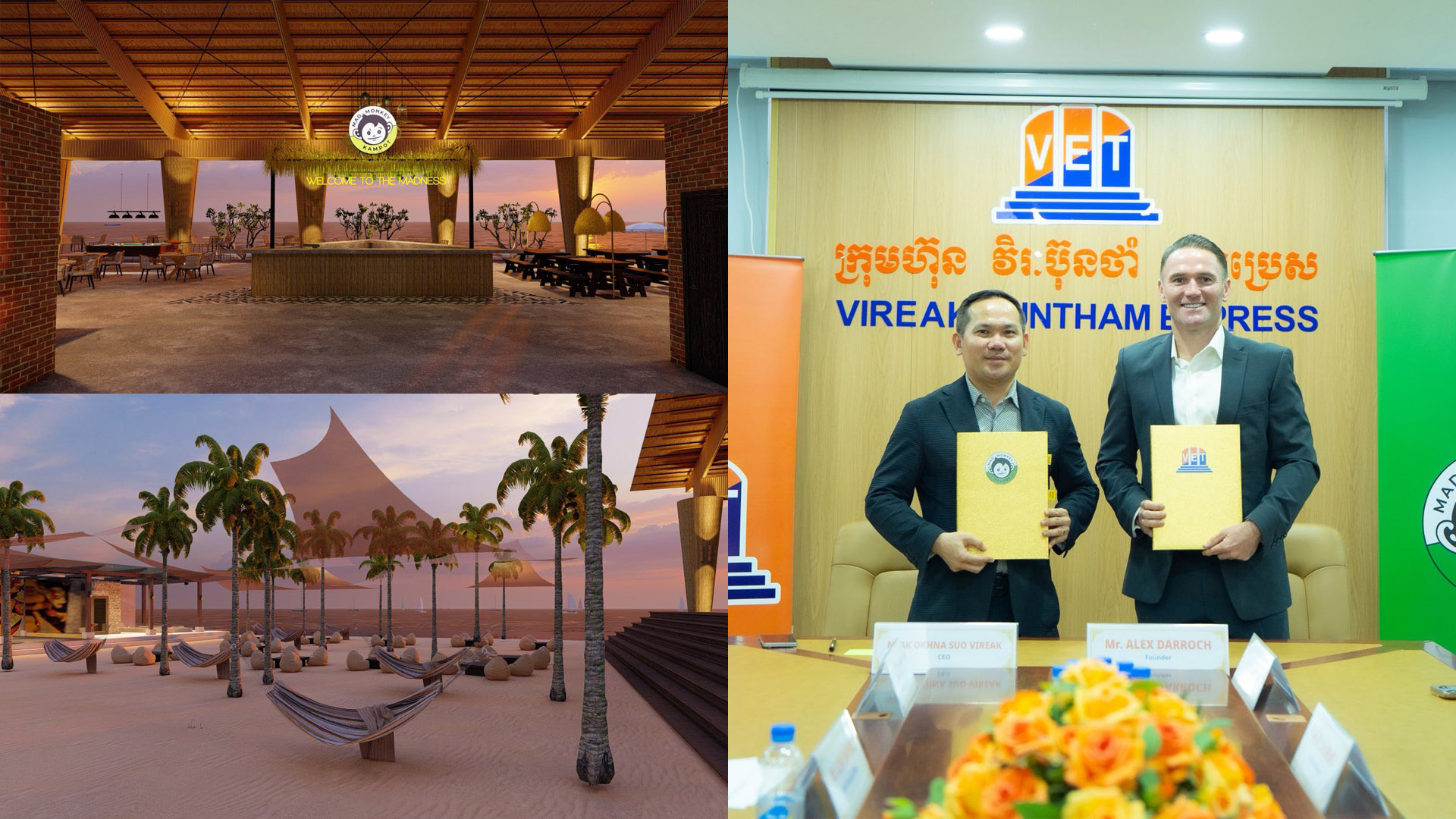 កិច្ចព្រមព្រៀងនៃការសហការណ៍ខាងលើនេះ ត្រូវបានចុះហត្ថលេខាផ្លូវការរវាង អ្នកឧកញ៉ា សួរ វីរៈ អគ្គនាយកប្រតិបត្តិនៃក្រុមហ៊ុន វិរៈ ប៊ុនថាំអិចប្រេស ឯ.ក និង លោក Alex Darroch សហស្ថាបនិកនៃក្រុមហ៊ុន Mad Monkey ដើម្បីចាប់ផ្តើមគម្រោងសណ្ឋាគារថ្មីមួយ ក្នុងខេត្តកំពត ដែលមានឈ្មោះថា Mad Monkey Kampot ។