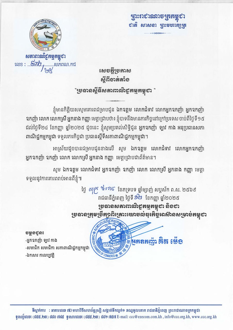 អ្នកឧកញ៉ា គិត ម៉េង ប្រធានសភាពាណិជ្ជកម្មកម្ពុជា និងជាប្រធានក្រុមប្រឹក្សាពិគ្រោះយោបល់ធុរកិច្ចអាស៊ានសម្រាប់កម្ពុជា កាលថ្ងៃទី១២ ខែកញ្ញា ឆ្នាំ២០២៥ បានចេញសេចក្តីប្រកាសចាត់តាំង អ្នកឧកញ៉ា ឡាវ កាង អនុប្រធានសភាពាណិជ្ជកម្មកម្ពុជា ឱ្យទទួលភារកិច្ចជា ប្រធានស្តីទីសភាពាណិជ្ជកម្មកម្ពុជា អំឡុងពេលដែលអ្នកឧកញ៉ាមានភារកិច្ចនៅក្រៅប្រទេសរយៈពេល ១០ថ្ងៃ ចាប់ពីថ្ងៃទី១៥ ដល់ថ្ងៃទី២៤ ខែកញ្ញា ឆ្នាំ២០២៥។