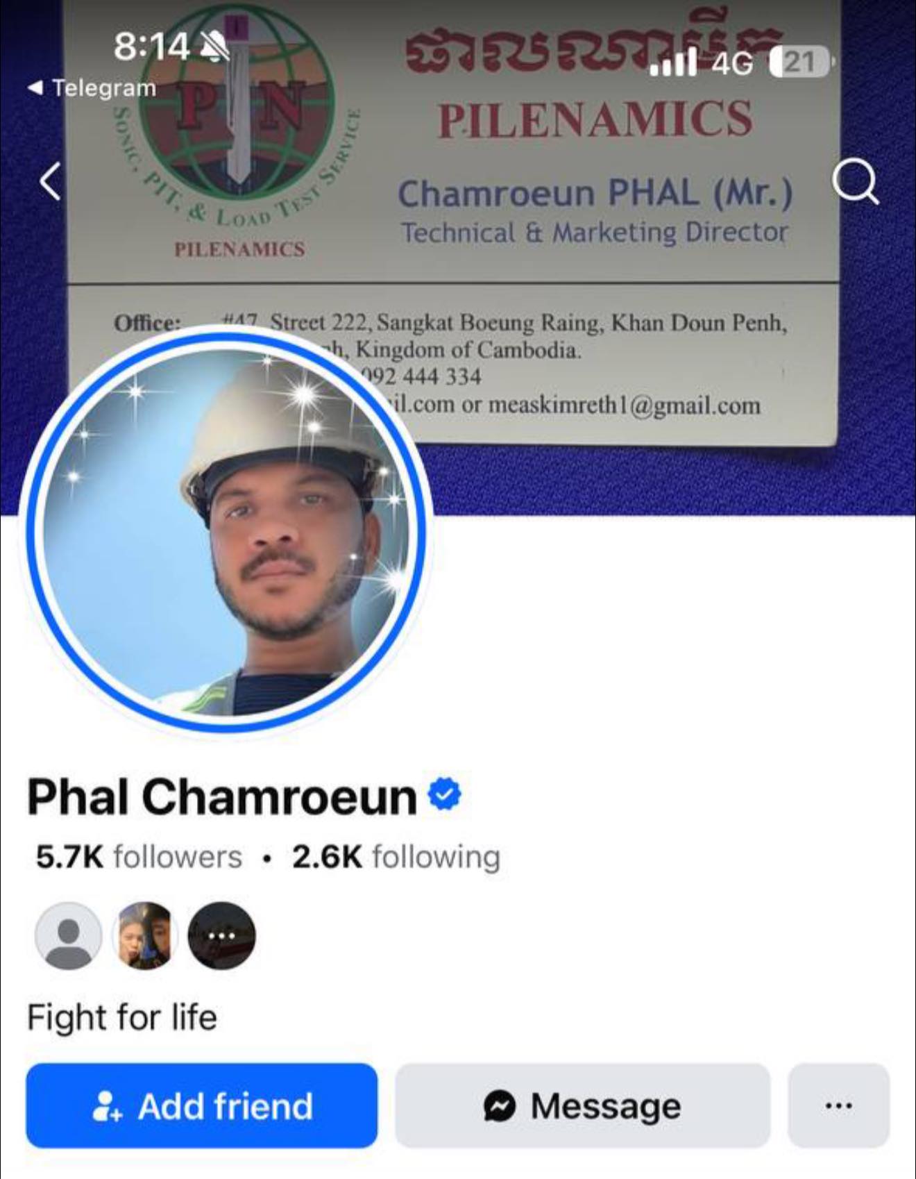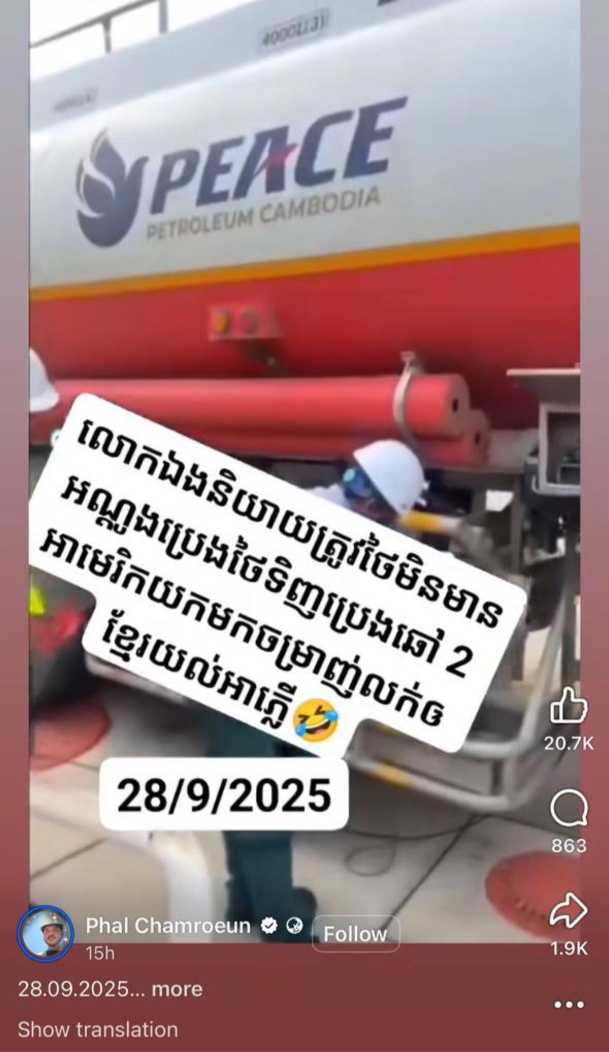 សូមជម្រាបថា កាលពីថ្ងៃទី២៩ ខែកញ្ញា ម្ចាស់គណនីហ្វេសប៊ុកឈ្មោះ Phal Chamroeun បានបង្ហោះសារអំពីការនាំចូលប្រេងរបស់ស្ថានីយរបស់ក្រុមហ៊ុន ភីស ភេត្រូលៀម (ខេមបូឌា) ដោយលោកនៅមិនជឿថា ជាការនាំចូលប្រេងរបស់ក្រុមហ៊ុនអាមេរិក និងបន្តចោទប្រកាន់មកលើក្រុមហ៊ុន PEACE ដោយគ្មានមូលដ្ឋាន។ ឆ្លើយតបទៅនឹងរឿងនេះ អ្នកឧកញ៉ា ទៀត វិចិត្រ ក៏បានចេញសារថា មនុស្សទ្រាំការលំបាកបាន ប៉ុន្តែមិនអាចទ្រាំឱ្យគេមើលងាយបាននោះទេ ស៊ូទ្រាំស្ងៀមស្ងាត់បាន ប៉ុន្តែមិនអាចទ្រាំឱ្យគេមួលបង្កាច់បានដាច់ខាត ជួបគ្នាឆាប់ៗ ម្ចាស់គណនីឈ្មោះ Phal Chamroeun៕