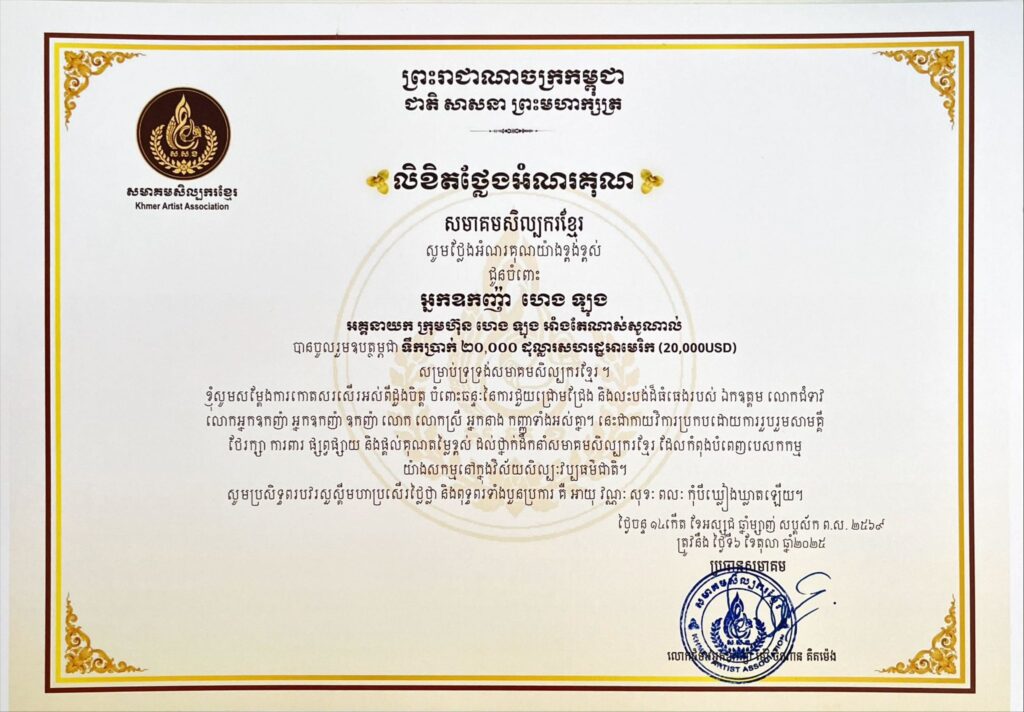 នៅថ្ងៃទី៦ ខែតុលា ឆ្នាំ២០២៥ លោកជំទាវអ្នកឧកញ៉ា ម៉ៅ ចំណាន គិតម៉េង ប្រធានសមាគមសិល្បករខ្មែរ បានចេញលិខិតថ្លែងអំណរគុណ ជូនចំពោះ អ្នកឧកញ៉ា ហេង ឡុង ដែលបានចូលរួមឧបត្ថម្ភថវិកា ២០,០០០ ដុល្លារ ជូនដល់សមាគម។