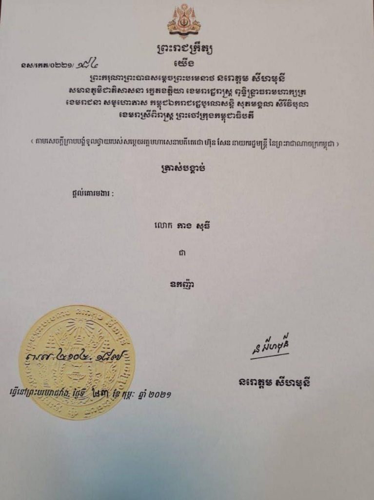 តាមព្រះរាជក្រឹត្យតែងតាំង លោក កាង សុធី ជា​«ឧកញ៉ា» ធ្វើ​នៅ​ព្រះបរមរាជវាំងនៅ​ថ្ងៃ ២៣ កុម្ភៈ ឆ្នាំ ២០២១ ៕