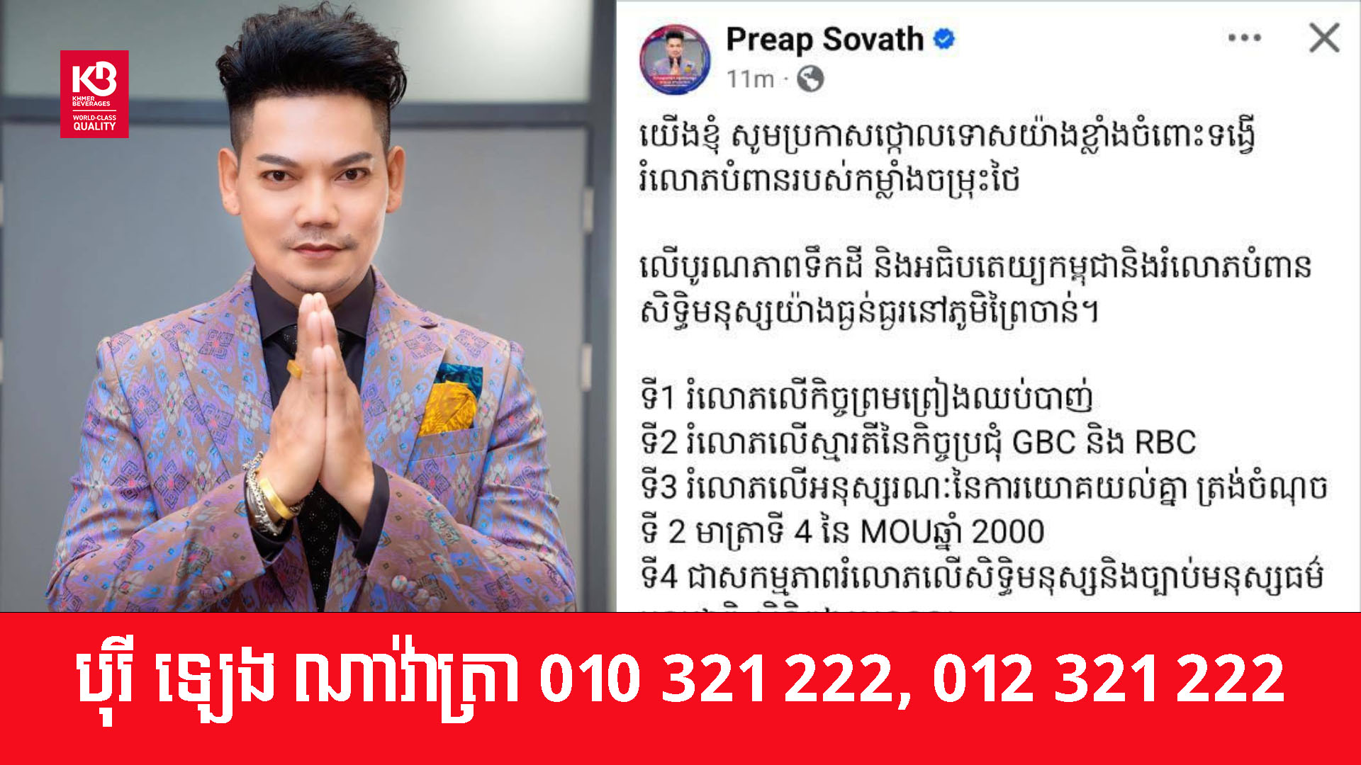 កំពូលតារាចម្រៀងឧកញ៉ា ព្រាប សុវត្ថិ បានចេញសារប្រកាសថ្កោសទោសយ៉ាងខ្លាំង ចំពោះទង្វើរំលោភបំពានរបស់អាជ្ញាធរថៃ មកដែនអធិបតេយ្យភាពជាតិ បូរណភាពទឹកដី និងសិទ្ធិមនុស្សមកលើប្រទេសកម្ពុជា យ៉ាងកម្រោល និងយ៉ាងគឃ្លើនបំផុត តាមរយៈការអនុវត្តច្បាប់របស់ថៃមកលើដែនអធិបតេយ្យកម្ពុជា។