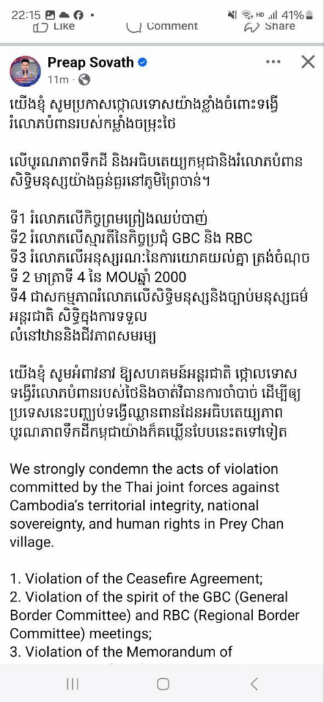 កាលពីយប់នៅថ្ងៃទី១០ ខែតុលា ឆ្នាំ២០២៥ កំពូលតារាចម្រៀង ឧកញ៉ា ព្រាប សុវត្ថិ បានប្រកាសលើបណ្តាញសង្គមយ៉ាងដូច្នេះថា «យើងខ្ញុំ សូមប្រកាសថ្កោលទោសយ៉ាងខ្លាំងចំពោះទង្វើរំលោភបំពានរបស់កម្លាំងចម្រុះថៃ
