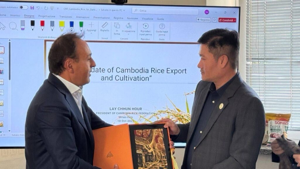 បន្ទាប់ពី ដំណើរបេសកកម្មចូលរួមការតាំងពិព័រណ៍ម្ហូបអាហារអន្តរជាតិ Anuga Food Fair 2025 នាទីក្រុងកូឡូញ ប្រទេសអាឡឺម៉ង់ ឧកញ៉ា ឡាយ ឈុនហួ ប្រធានសហព័ន្ធស្រូវអង្ករកម្ពុជា បានដឹកនាំសមាជិកចំនួន ៦ ក្រុមហ៊ុន ក្នុងនោះ មាន ១) ក្រុមហ៊ុន ព្រីម្លិះ ខបភើរេសិន ២) ក្រុមហ៊ុន ស៊ីធី រ៉ាយស៍ អ៊ីមផត អិចផត ខូអិលធីឌី ៣) ក្រុមហ៊ុន ហ្គោលដេន ស្ដារ រ៉ាយស៍ មីល អេន អ៊ីមផត អិចផត ៤) ក្រុមហ៊ុន កំពង់ធំ រ៉ាយស៍ មីល លីមីធីត ៥) ក្រុមហ៊ុន ដេលី ហ្រ្វេស ហ្វ៊ូដ (ខេមបូឌា) ឯ.ក និង ៦) ក្រុមហ៊ុន ស៊ីកនេតឈ័រ រ៉ាយស៍ ឯ.ក ជួបពិភាក្សាជាមួយលោក Bruno Sempio ប្រធានក្រុមប្រឹក្សាភិបាល របស់ក្រុមហ៊ុន Euricom S.P.A និង លោកស្រី Lombado Paolina ប្រធានគ្រប់គ្រងនាំចេញរបស់ក្រុមហ៊ុន។