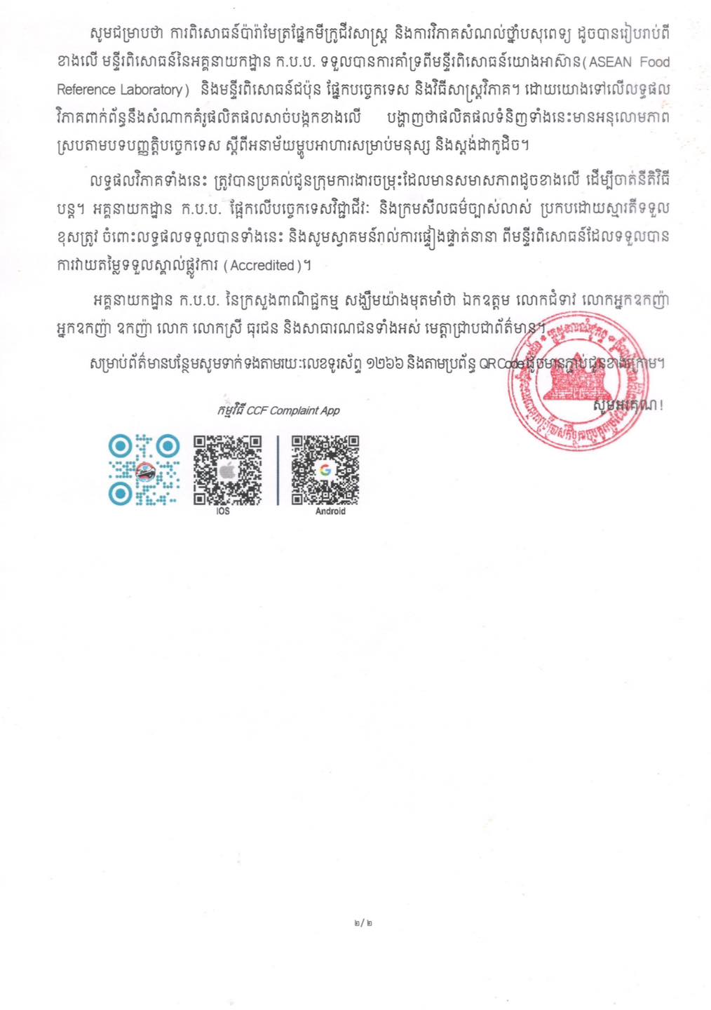 សេចក្តីប្រកាសព័ត៌មាន បានបញ្ជាក់ថា លទ្ធផលវិភាគទាំងនេះ ត្រូវបានប្រគល់ជូនក្រុមការងារចម្រុះ ដើម្បីចាត់នីតិវិធីបន្ត។ អគ្គនាយកដ្ឋាន ក.ប.ប ផ្អែកលើបច្ចេកទេសវិជ្ជាជីវៈ និងក្រមសីលធម៌ច្បាស់លាស់ ប្រកបដោយស្មារតីទទួលខុសត្រូវ ចំពោះលទ្ធផលទទួលបានទាំងនេះ និងសូមស្វាគមន៍រាល់ការផ្ទៀងផ្ទាត់នានា ពីមន្ទីរពិសោធន៍ដែលទទួលបានការវាយតម្លៃទទួលស្គាល់ផ្លូវការ (Accredited)។