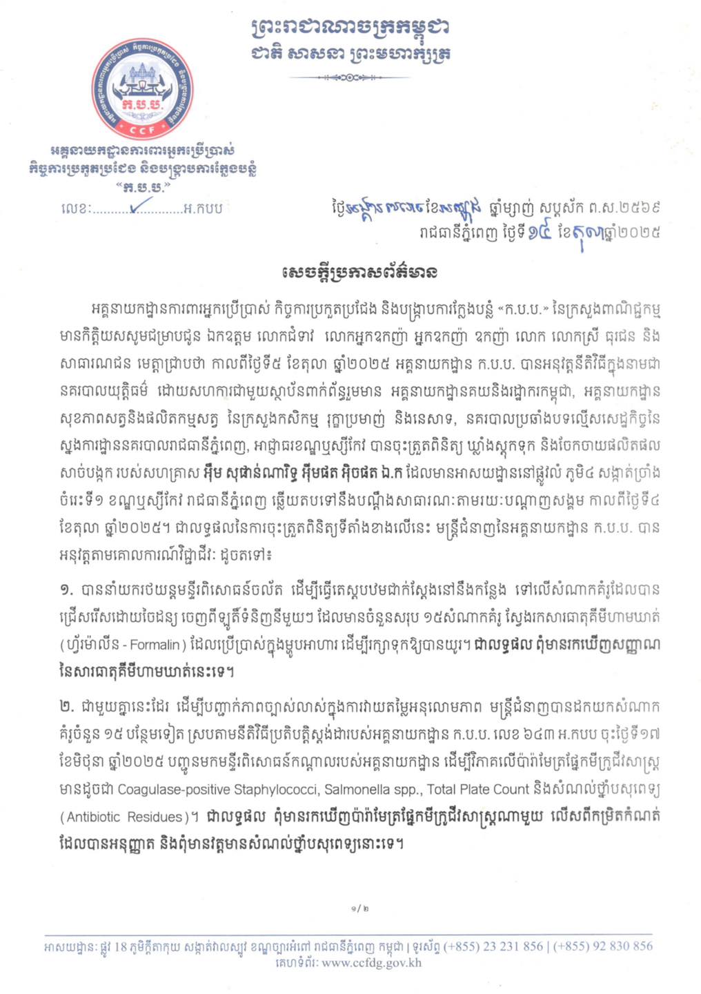 ក.ប.ប បានឱ្យដឹងថា ក្រោយការចុះពិនិត្យរបស់មន្ត្រីជំនាញ កាលពីថ្ងៃទី៥ ខែតុលា ឆ្នាំ២០២៥ ដែលបានចុះពិនិត្យ ឃ្លាំងស្តុកទុក និងចែកចាយផលិតផលសាច់បង្កក របស់សហគ្រាស អុឹម សុផាន់ណារិទ្ធ អុឹមផត អុិចផត ឯ.ក ជាលទ្ធផលឃើញថា ពុំមានរកឃើញសញ្ញាណនៃសារធាតុគីមីហាមឃាត់ទេ ហើយក៏ពុំមានរកឃើញប៉ារ៉ាម៉ែត្រផ្នែកមីក្រូជីវសាស្ត្រណាមួយ លើសពីកម្រិតកំណត់ដែលបានអនុញ្ញាត និងពុំមានសំណល់ថ្នាំបសុពេទ្យនោះទេ។