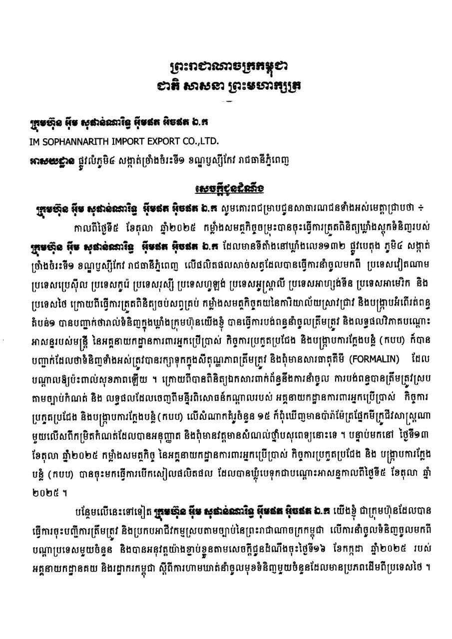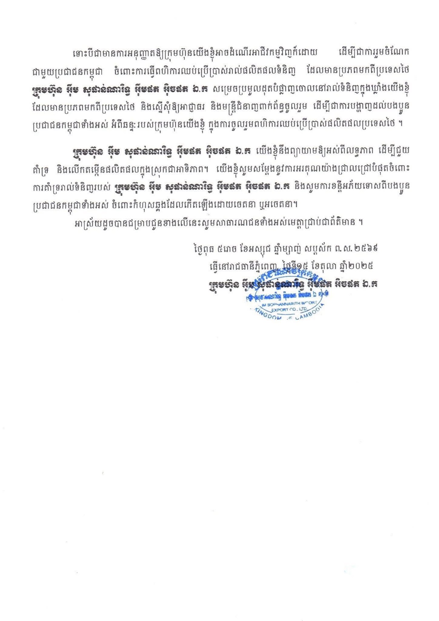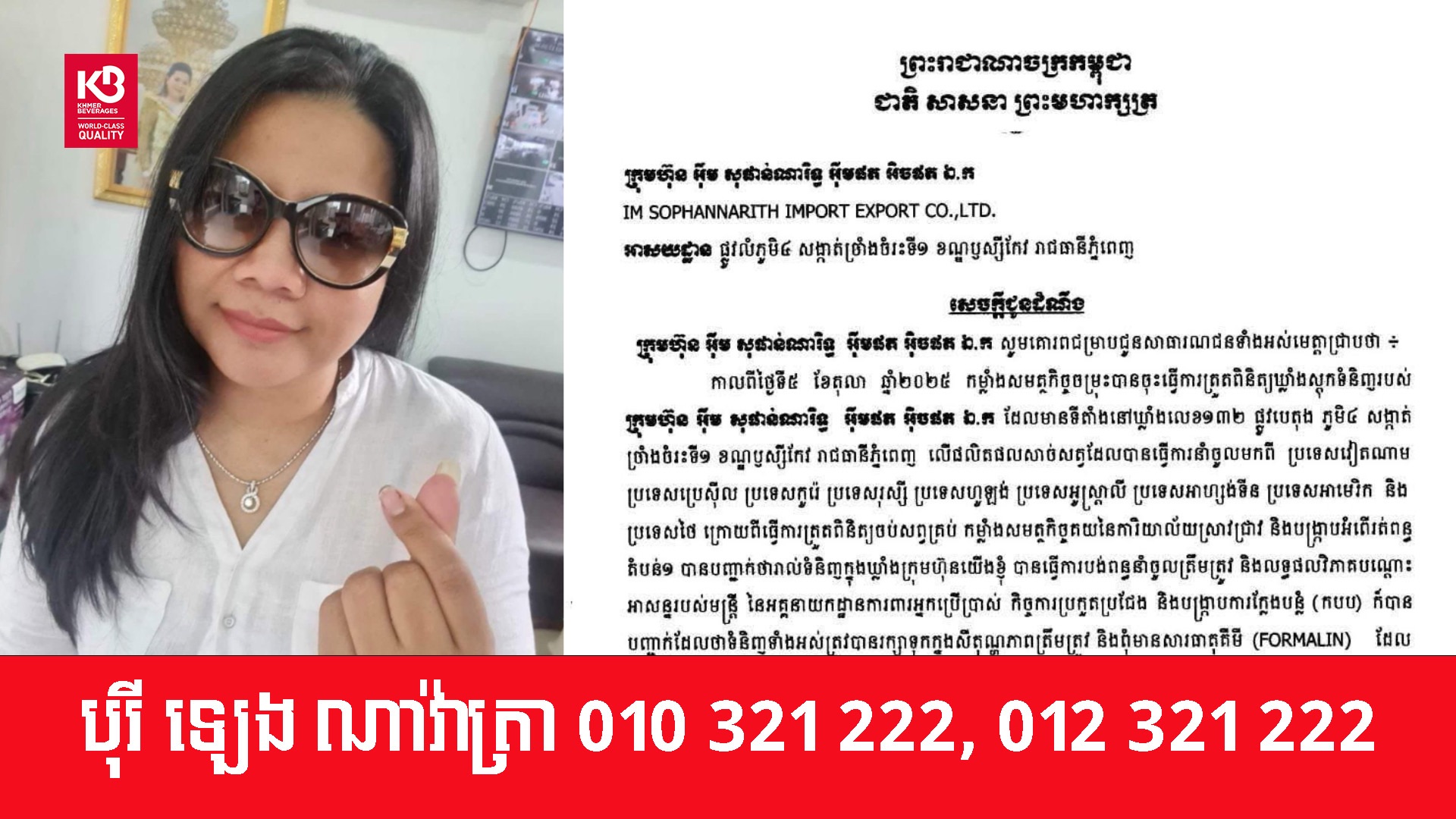 សូមជម្រាបថា នៅថ្ងៃទី១៤ ខែតុលា ឆ្នាំ២០២៥ កបប បានចេញសេចក្តីប្រកាសព័ត៌មានបញ្ជាក់ថា ផលិតផលសាច់បង្កក របស់សហគ្រាស អុឹម សុផាន់ណារិទ្ធ អុឹមផត អុិចផត ឯ.ក របស់អតីតឧកញ៉ា អុឹម សុផាន់ណារិទ្ធ ដែលមានអាសយដ្ឋាននៅផ្លូវលំ ភូមិ៤ សង្កាត់ច្រាំងចំរេះទី១ ខណ្ឌឬស្សីកែវ រាជធានីភ្នំពេញ គឺមានស្ថានភាពល្អ ពុំមានសារធាតុហាមឃាត់ទេ ហើយក៏ពុំមានរកឃើញប៉ារ៉ាម៉ែត្រផ្នែកមីក្រូជីវសាស្ត្រណាមួយ លើសពីកម្រិតកំណត់ដែលបានអនុញ្ញាត និងពុំមានសំណល់ថ្នាំបសុពេទ្យផងដែរ៕